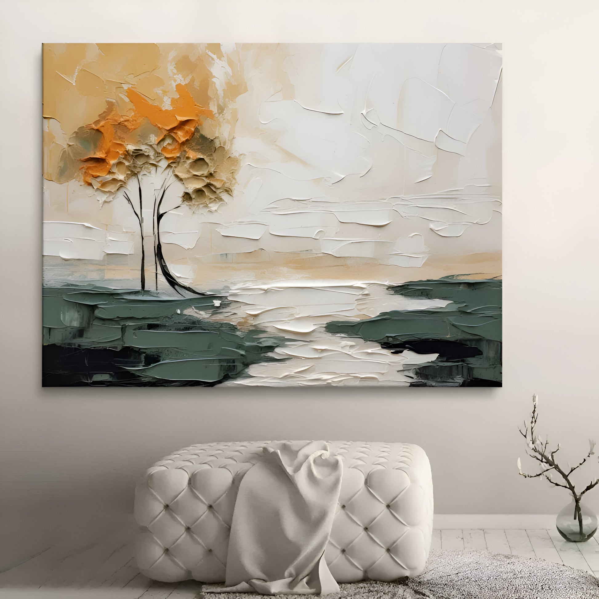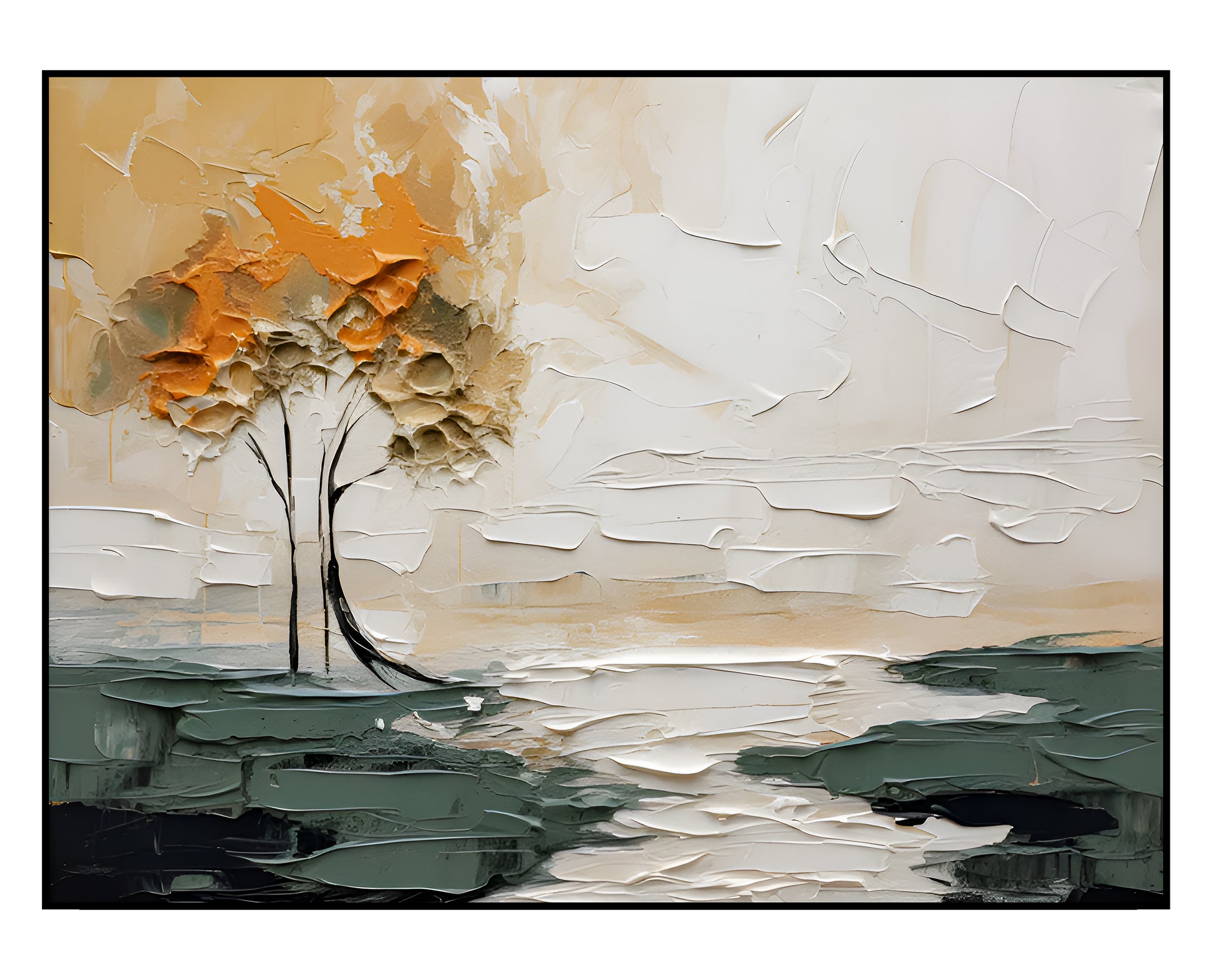 Amber Haven captures a moment of quiet refuge, where a golden canopy rises against pale skies and deep earth tones. The thick, textured strokes lend weight and permanence to the scene, while the twin trees stand as symbols of companionship and resilience. This work brings both warmth and grounding presence, making it a striking focal point for interiors that value balance, depth, and natural beauty.