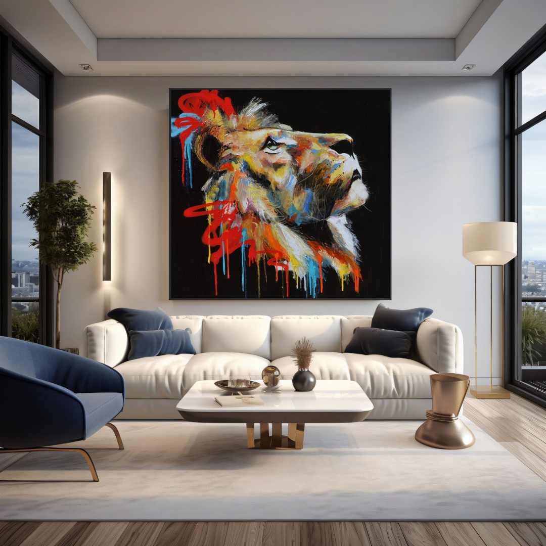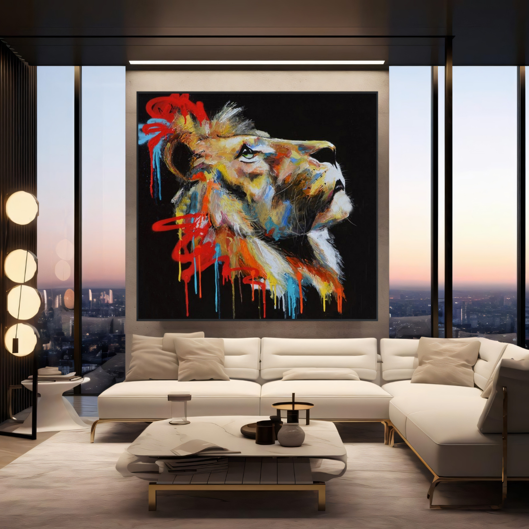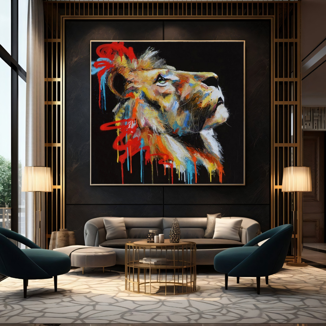 The lion’s looks contemplatively towards the sky, its eyes brimming with purpose and quiet strength. Its mane, an abstract burst of graffiti-inspired shades—burnt orange, electric blue, and scarlet—tells a story of transformation. This painting reflects the fire of resilience, a creature looking beyond the horizon, embodying a spirit that thrives amid chaos and beauty.