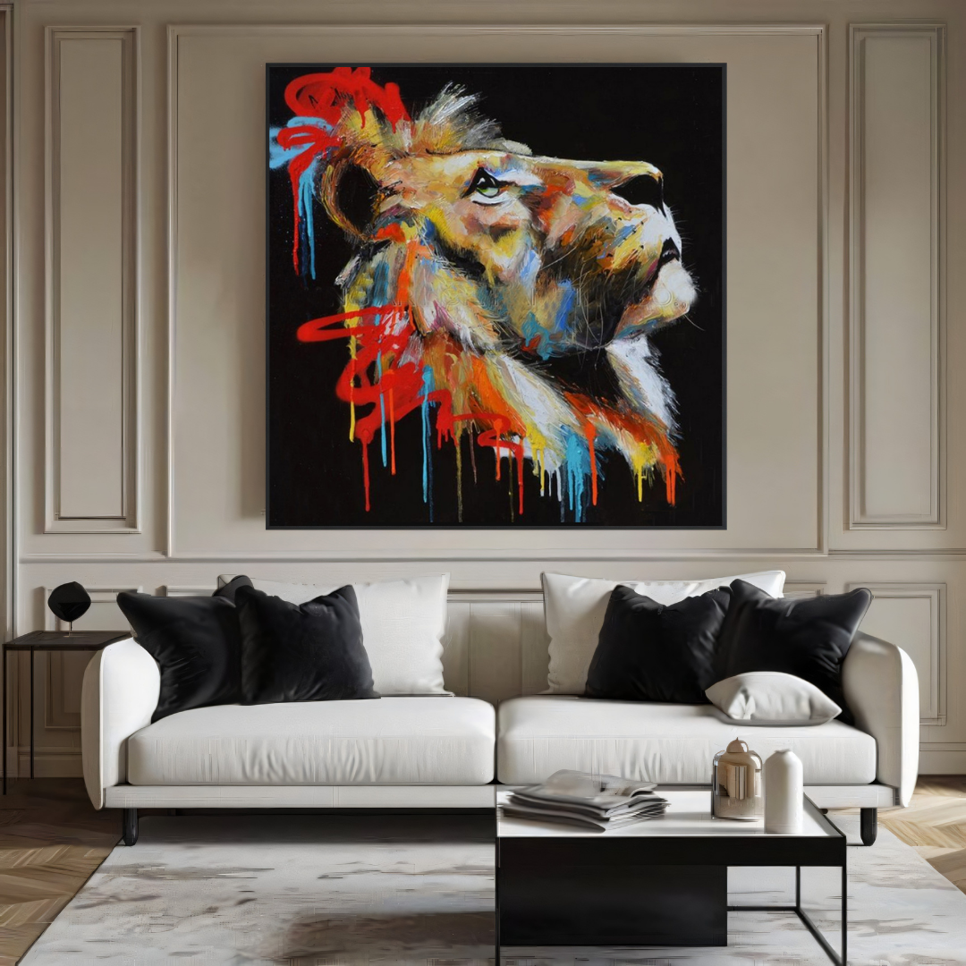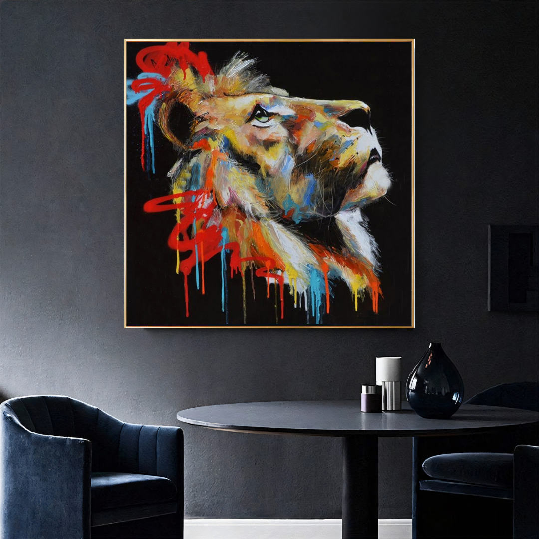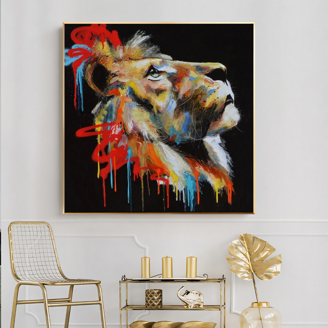 The lion’s looks contemplatively towards the sky, its eyes brimming with purpose and quiet strength. Its mane, an abstract burst of graffiti-inspired shades—burnt orange, electric blue, and scarlet—tells a story of transformation. This painting reflects the fire of resilience, a creature looking beyond the horizon, embodying a spirit that thrives amid chaos and beauty.
