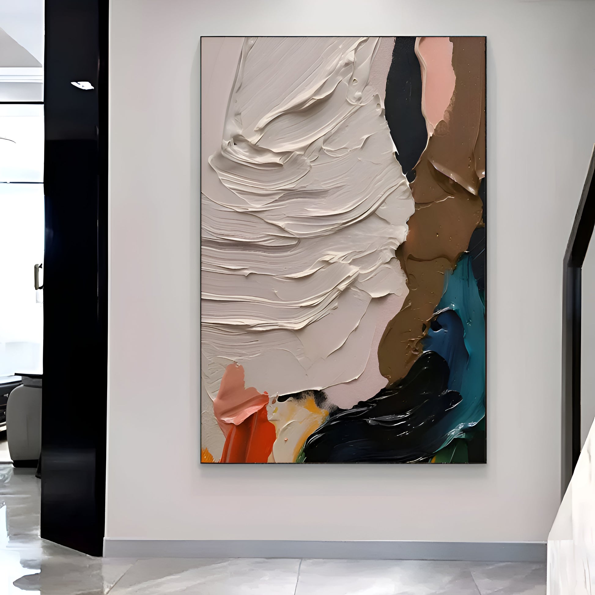 Broad layers move like sediment compacted by time, yet beneath the weight a rhythm persists. Cream, earth, and muted tones converge, anchored by strokes that suggest breath stilled yet still present.