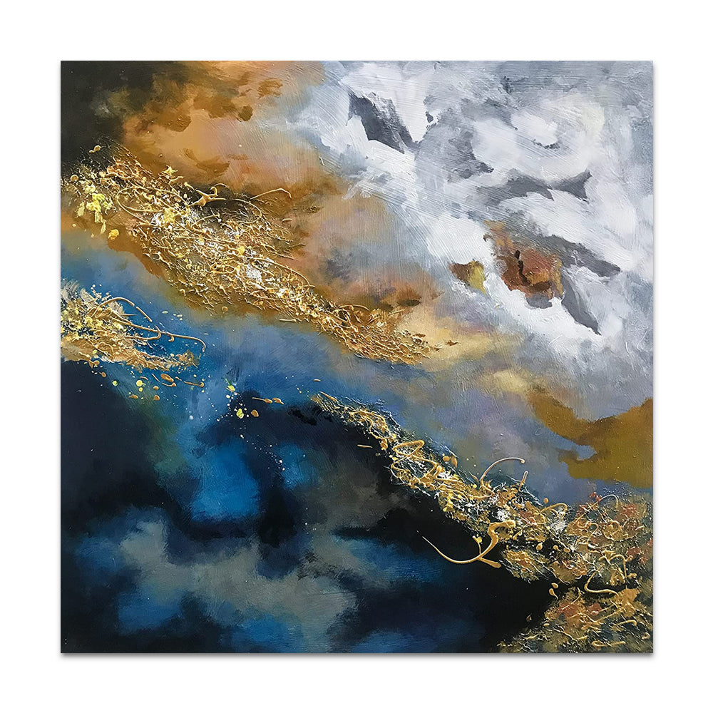 A cascade of luminous gold threads weaves through a celestial landscape of deep blues, soft whites, and earthy tones. This piece captures the ethereal dance between light and shadow, where fluid motion contrasts with intricate detail. The gilded elements shimmer like veins of treasure within the earth, bridging the tangible and the transcendent. Evoking the boundless expanse of sky and sea, 'Auric Drift' invites the viewer to journey through a world of discovery, where each layer reveals a story of transformation, energy, and the quiet splendor of nature’s grandeur.