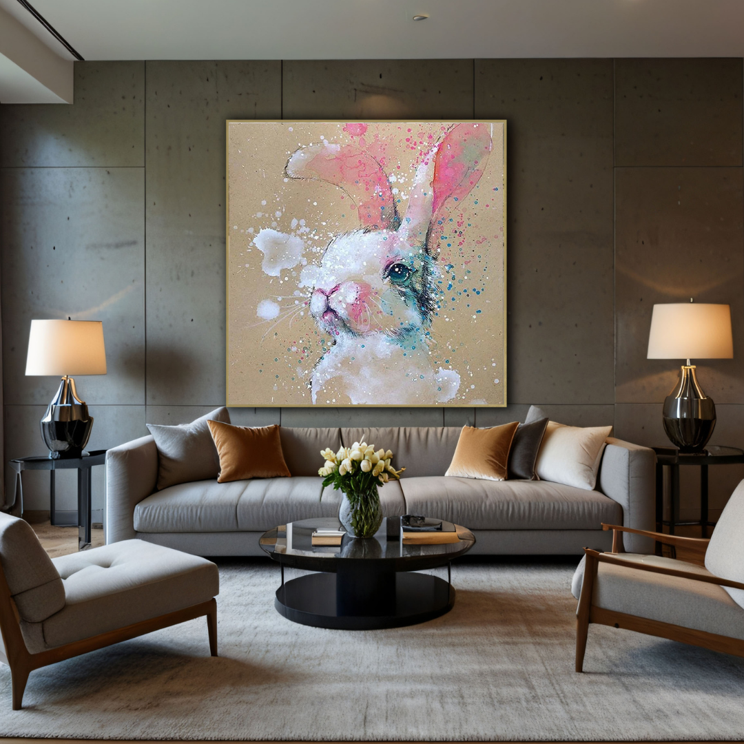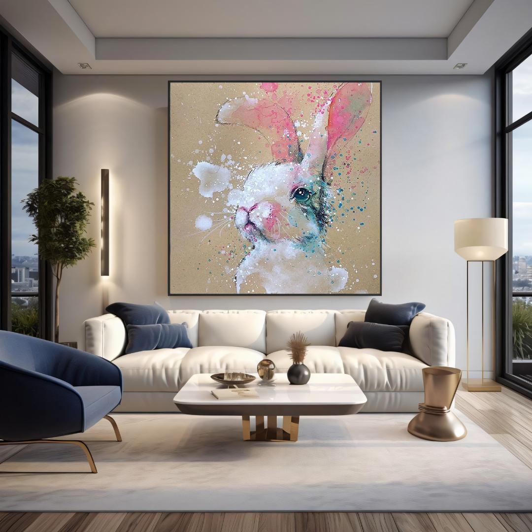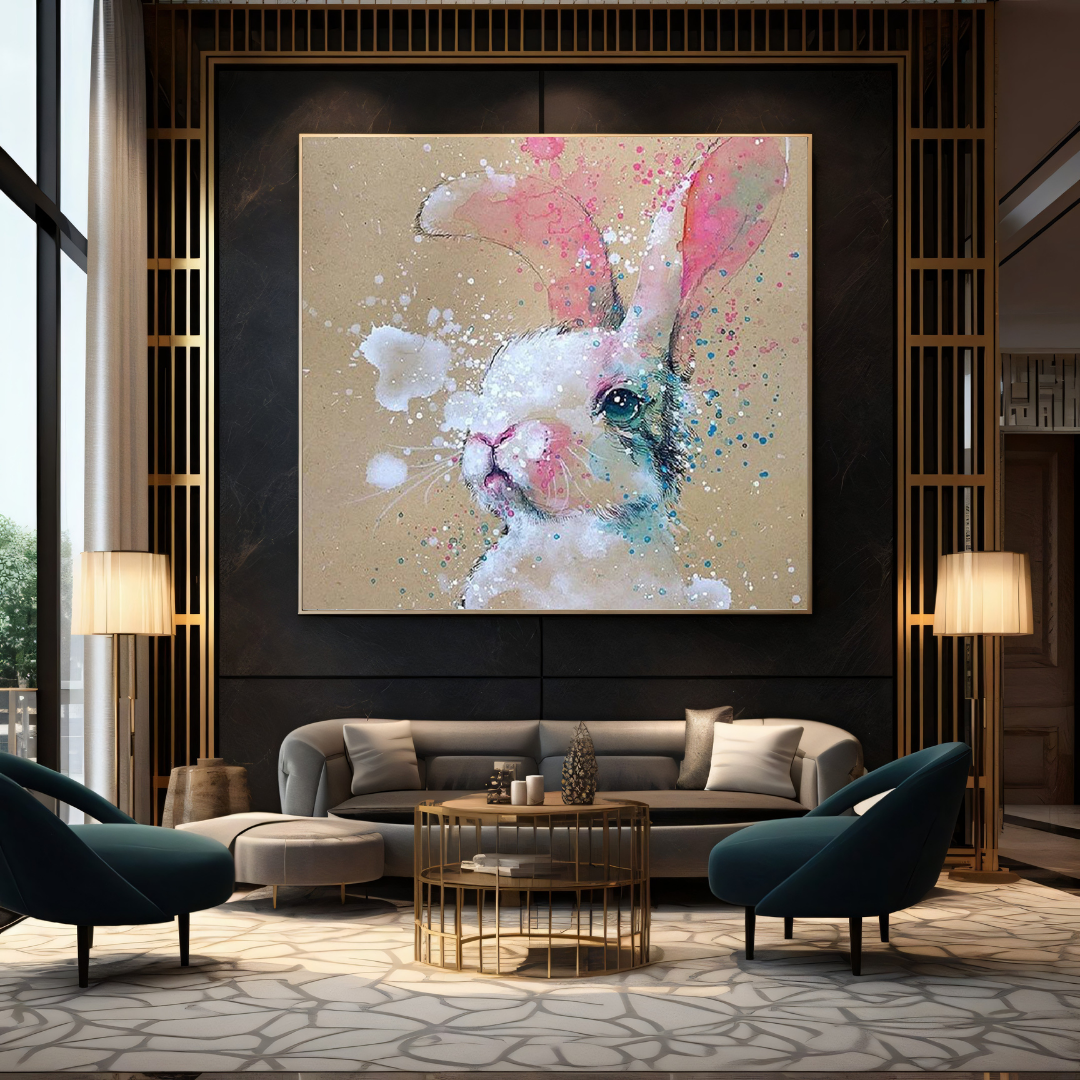 A rabbit, its ears poised in alert elegance, is captured mid-thought in a world alive with color. Splatters of pink, turquoise, and cream dance across the canvas, portraying the delicate balance of innocence and wisdom in both creatures and humans. This artwork celebrates the inquisitive nature within us all, sparking a deeper reflection on the shared instinct to explore and understand the world around us.