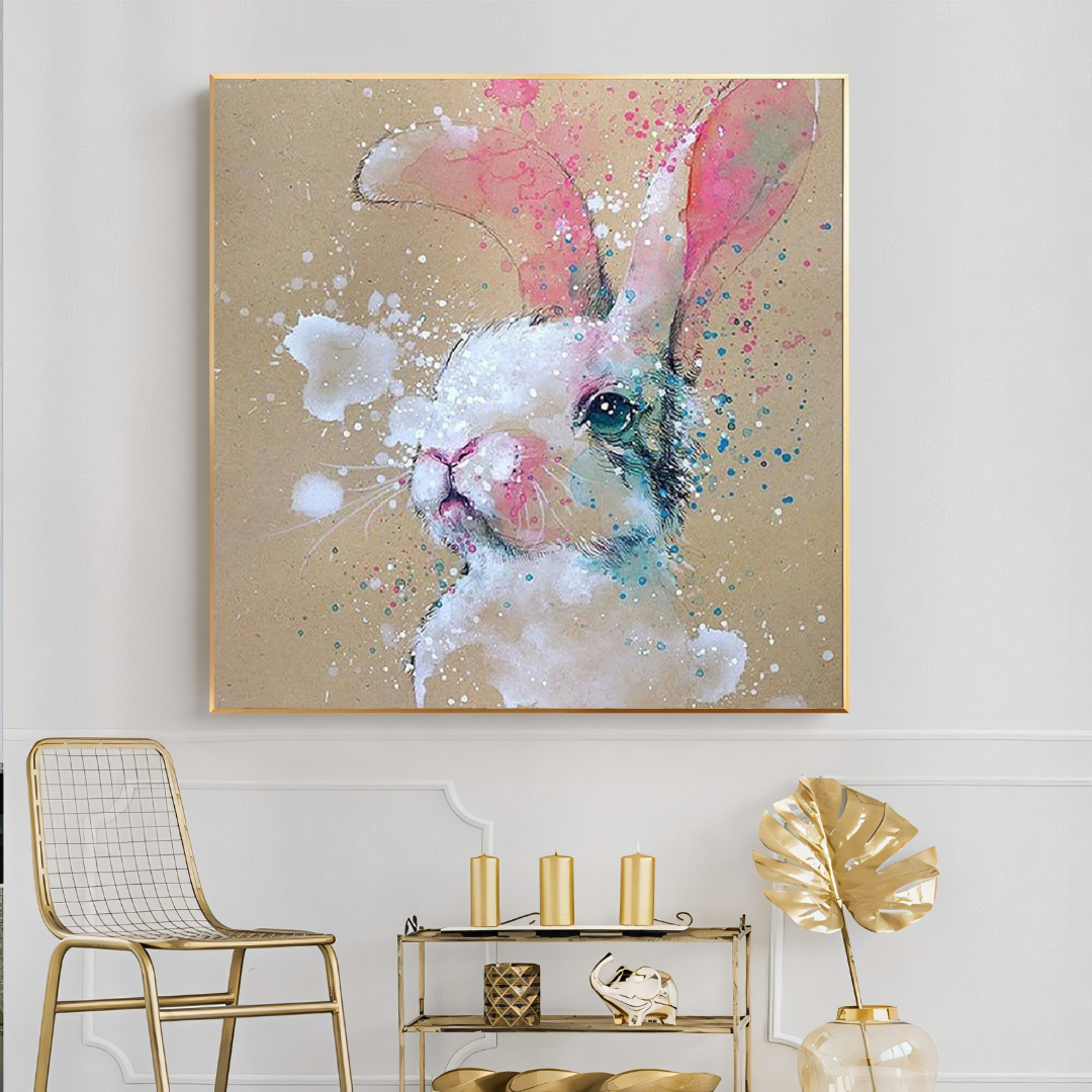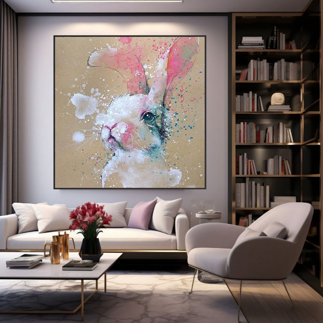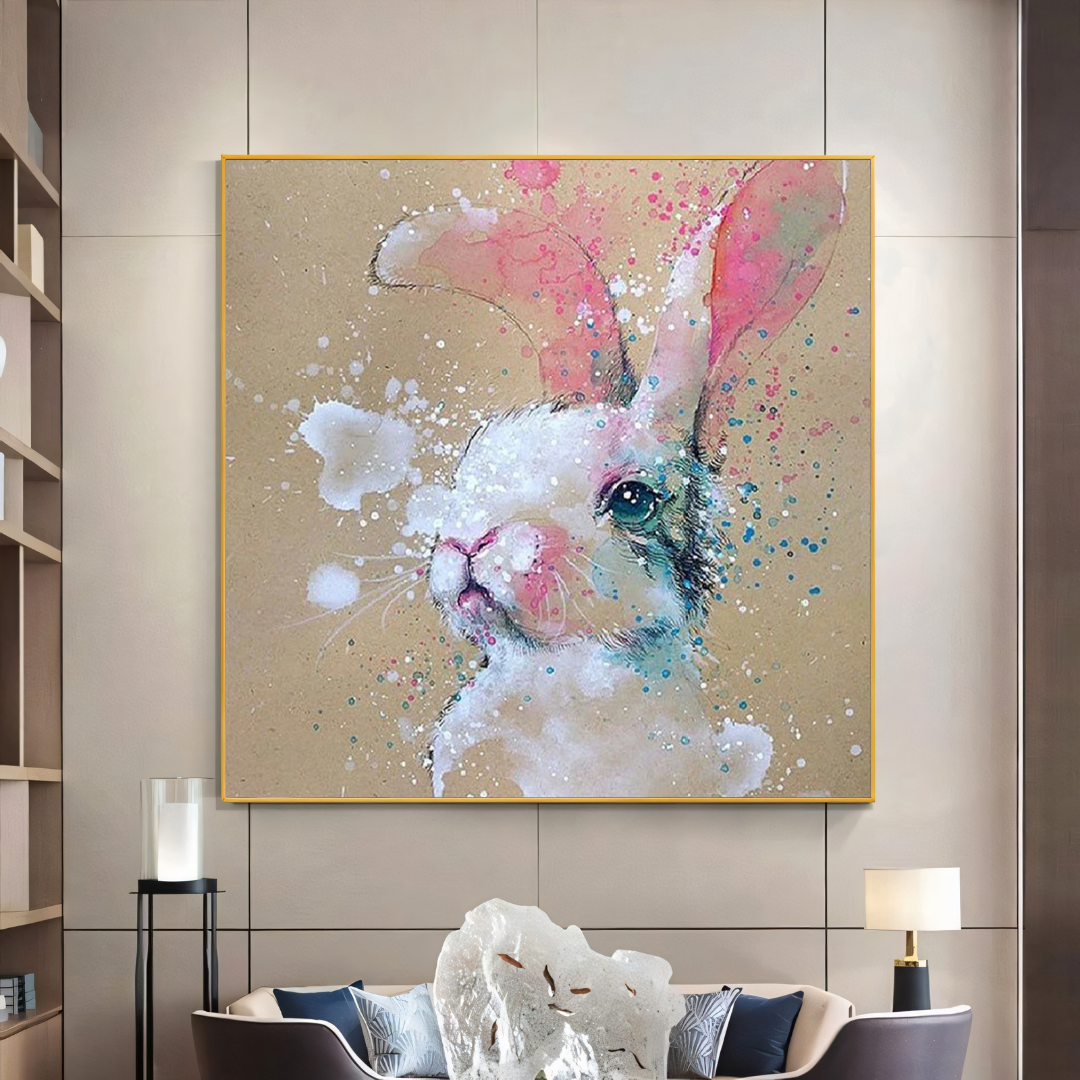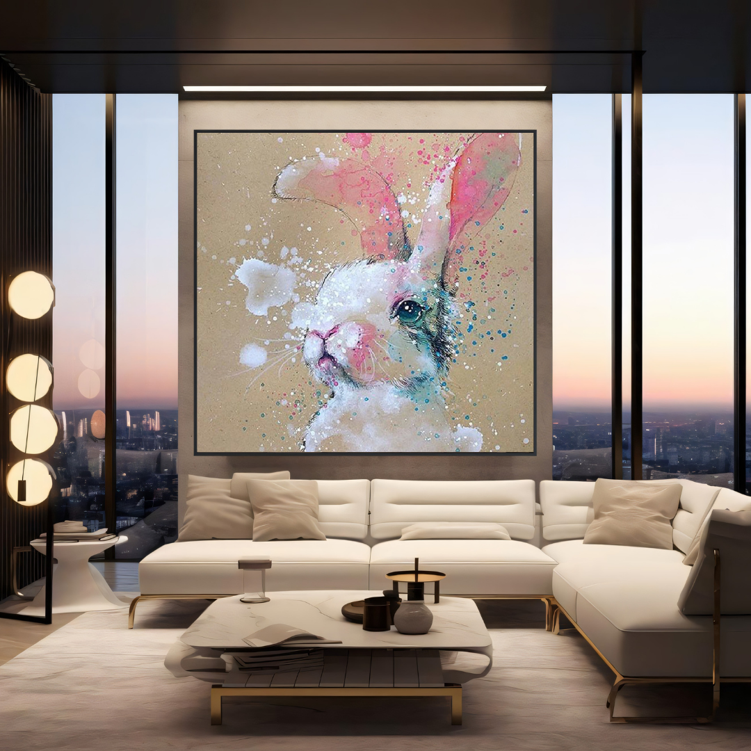 A rabbit, its ears poised in alert elegance, is captured mid-thought in a world alive with color. Splatters of pink, turquoise, and cream dance across the canvas, portraying the delicate balance of innocence and wisdom in both creatures and humans. This artwork celebrates the inquisitive nature within us all, sparking a deeper reflection on the shared instinct to explore and understand the world around us.