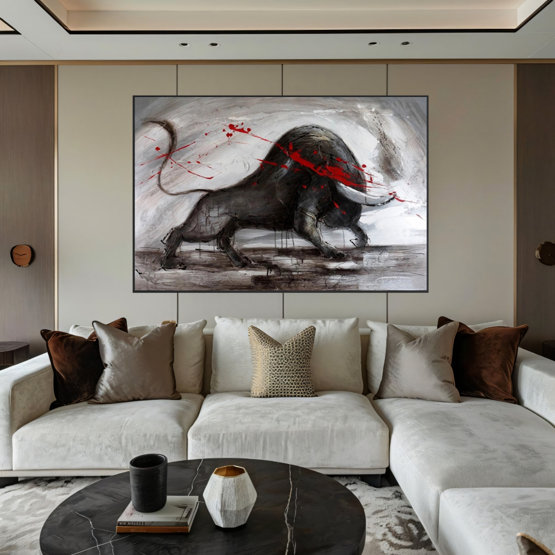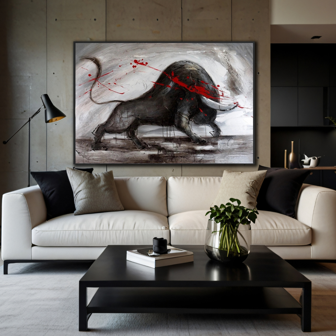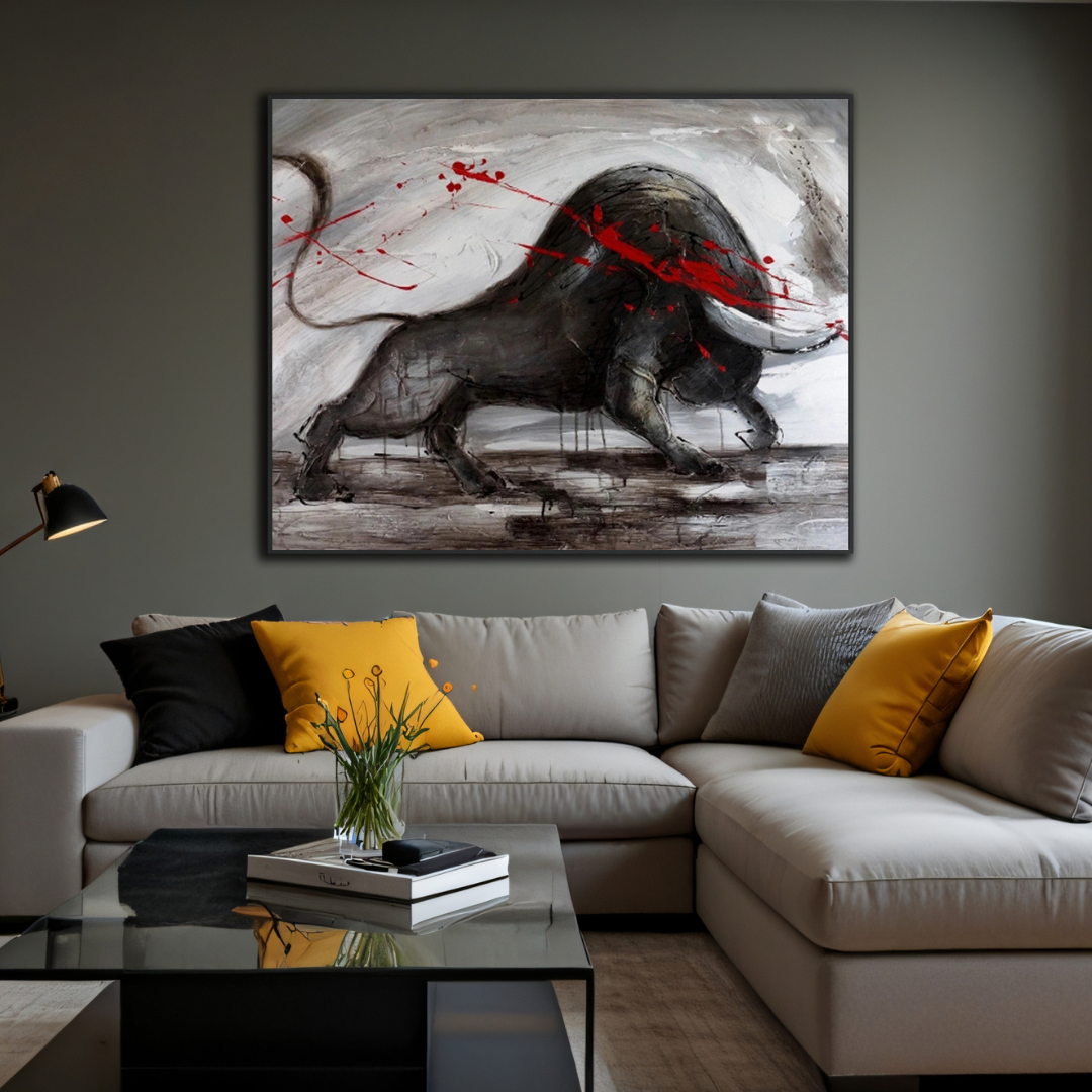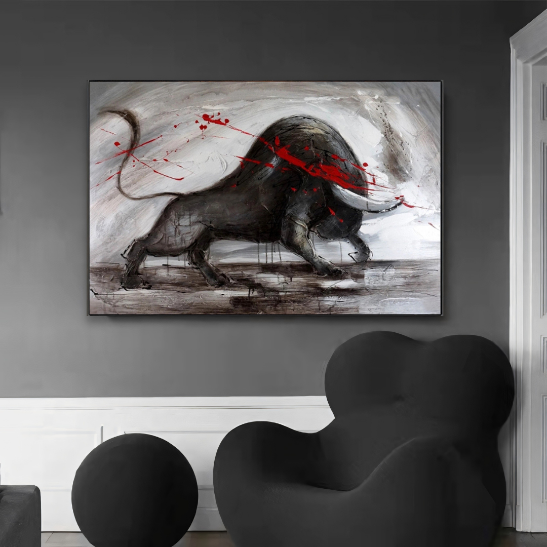 Amid a storm of swirling shadows, the bull charges forward—unyielding, unbroken. The red streaks slashing across its form tell a tale of conflict, a dance between predator and prey, life and survival. Each stroke on its textured hide reveals the scars of past battles, a testament to its resilience. The world around it blurs into chaos, yet the bull remains steadfast, a figure of primal determination. "Crimson Defiance" speaks to the human condition, a reminder of the courage required to face life's fiercest storms.