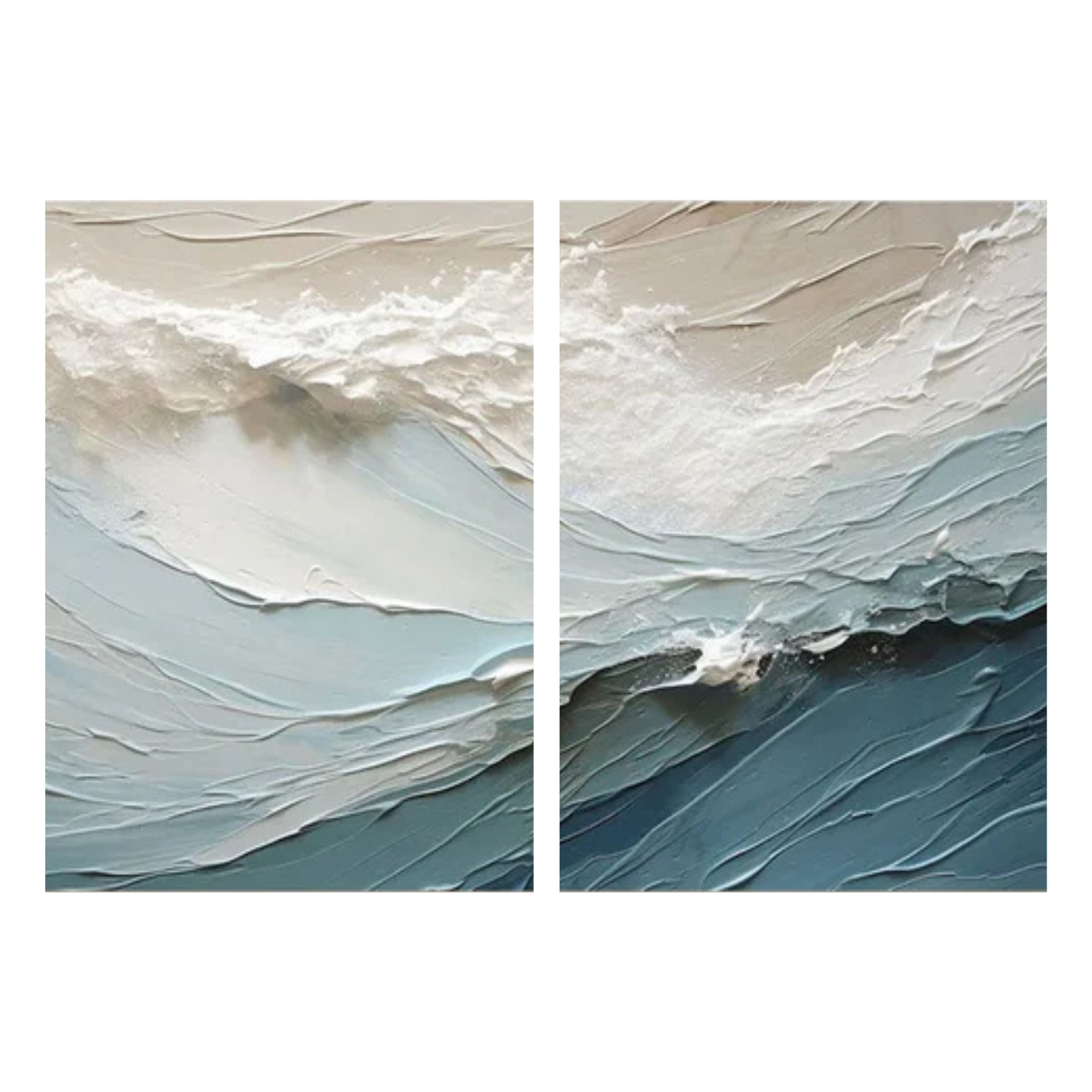 This two-part composition captures the force and grace of the ocean’s waves. Each piece flows into the next, creating a rhythm of powerful teal crests breaking into delicate foam—a meditation on movement and interconnectedness.