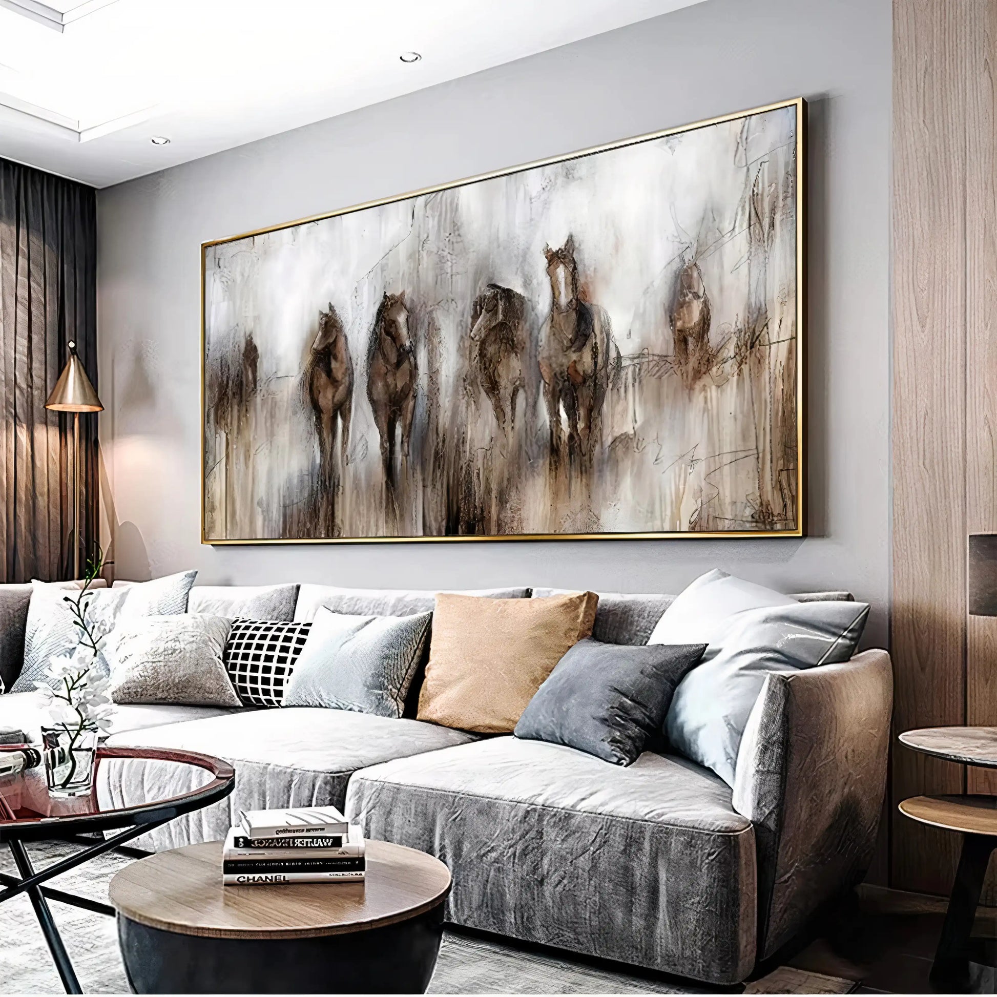 A procession of horses emerges through shifting veils of mist, their forms both grounded and spectral. The artist captures motion as memory, hooves that seem to echo across time, strength tempered by silence. Each figure dissolves into painterly strokes, embodying both endurance and transience. Horses, long symbols of freedom and spirit, here take on an almost dreamlike presence, moving not across land but through atmosphere itself.