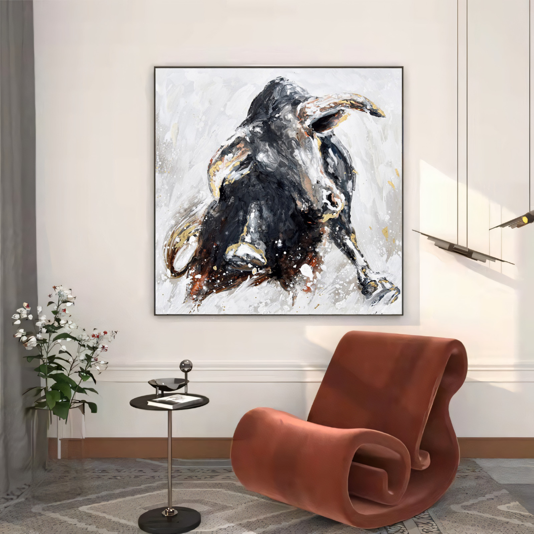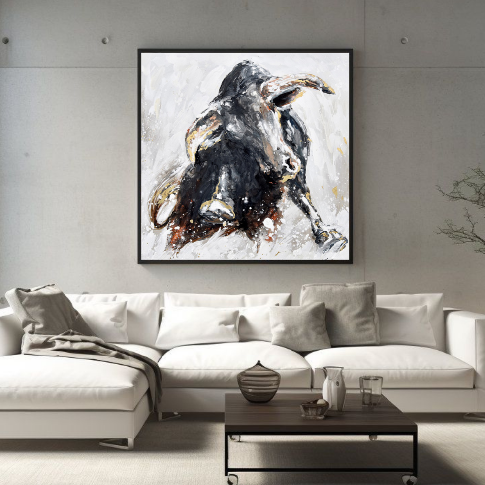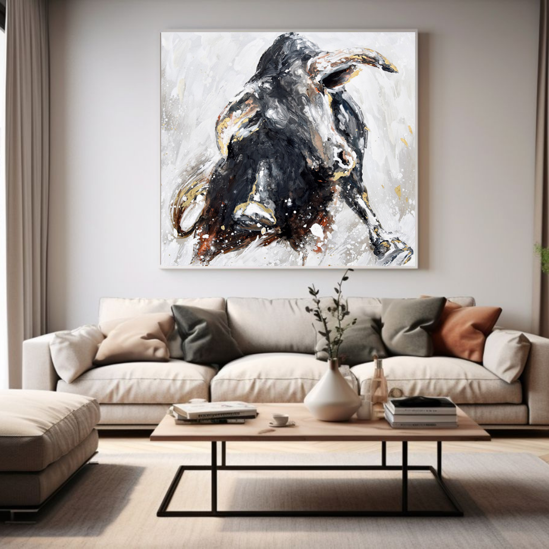 An abstract bull bursts forward in a blur of motion, its body a cascade of fiery reds, deep blacks, and molten bronze. This is not just a creature of strength but a symbol of unstoppable determination. Each stroke in the composition vibrates with energy, representing the courage to face challenges head-on and emerge victorious.