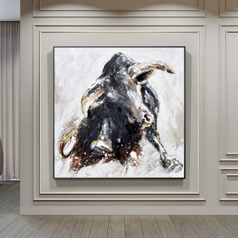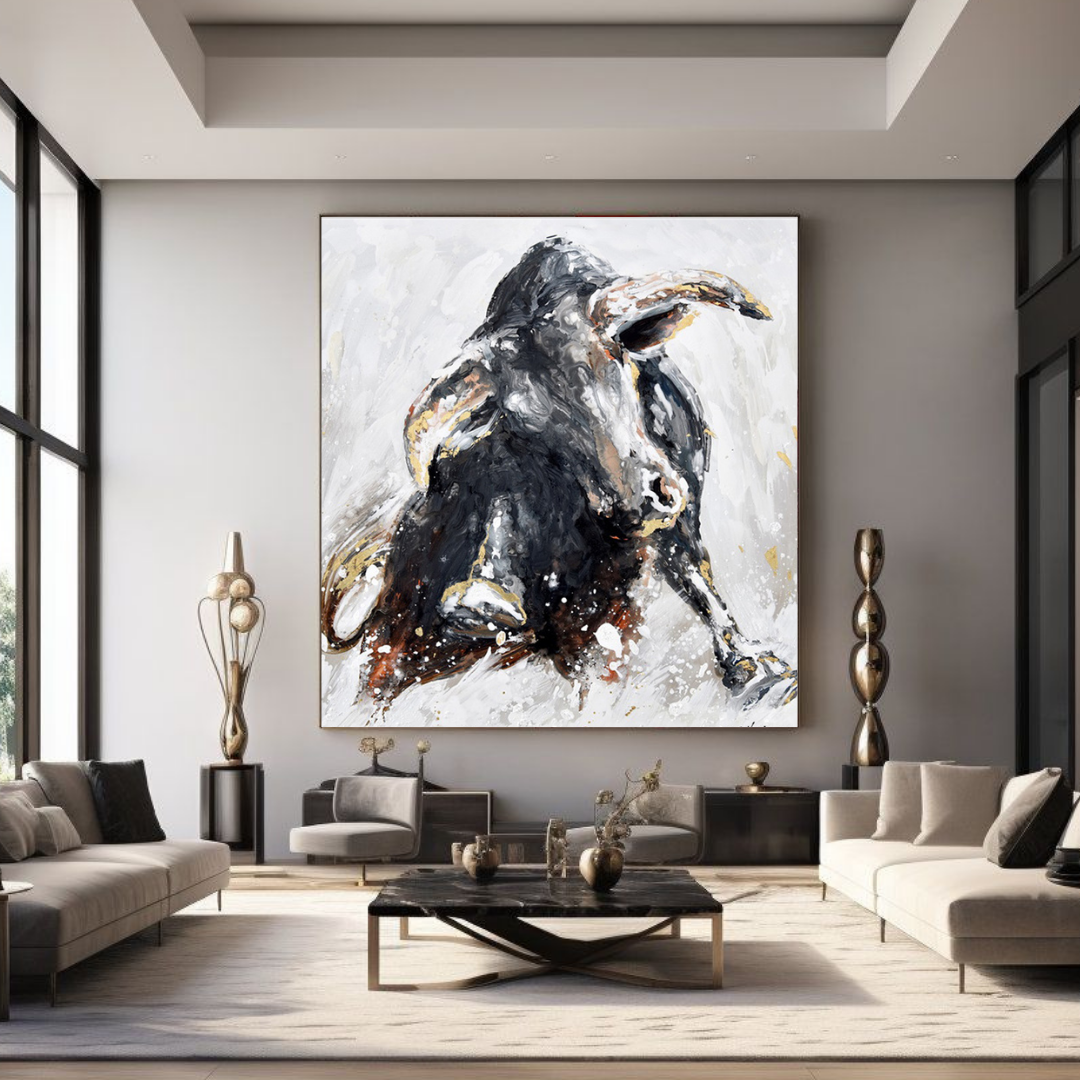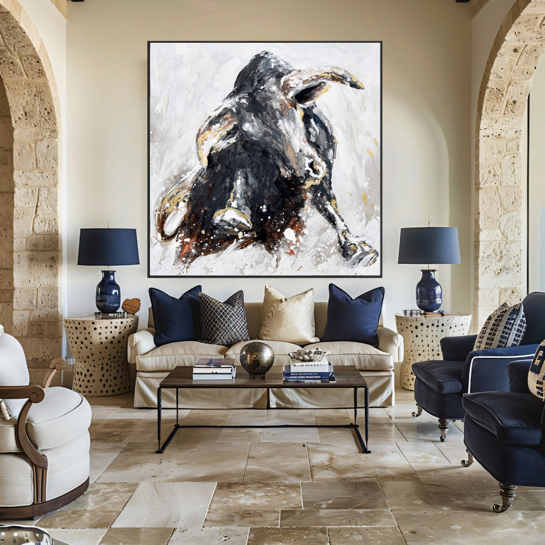 An abstract bull bursts forward in a blur of motion, its body a cascade of fiery reds, deep blacks, and molten bronze. This is not just a creature of strength but a symbol of unstoppable determination. Each stroke in the composition vibrates with energy, representing the courage to face challenges head-on and emerge victorious.