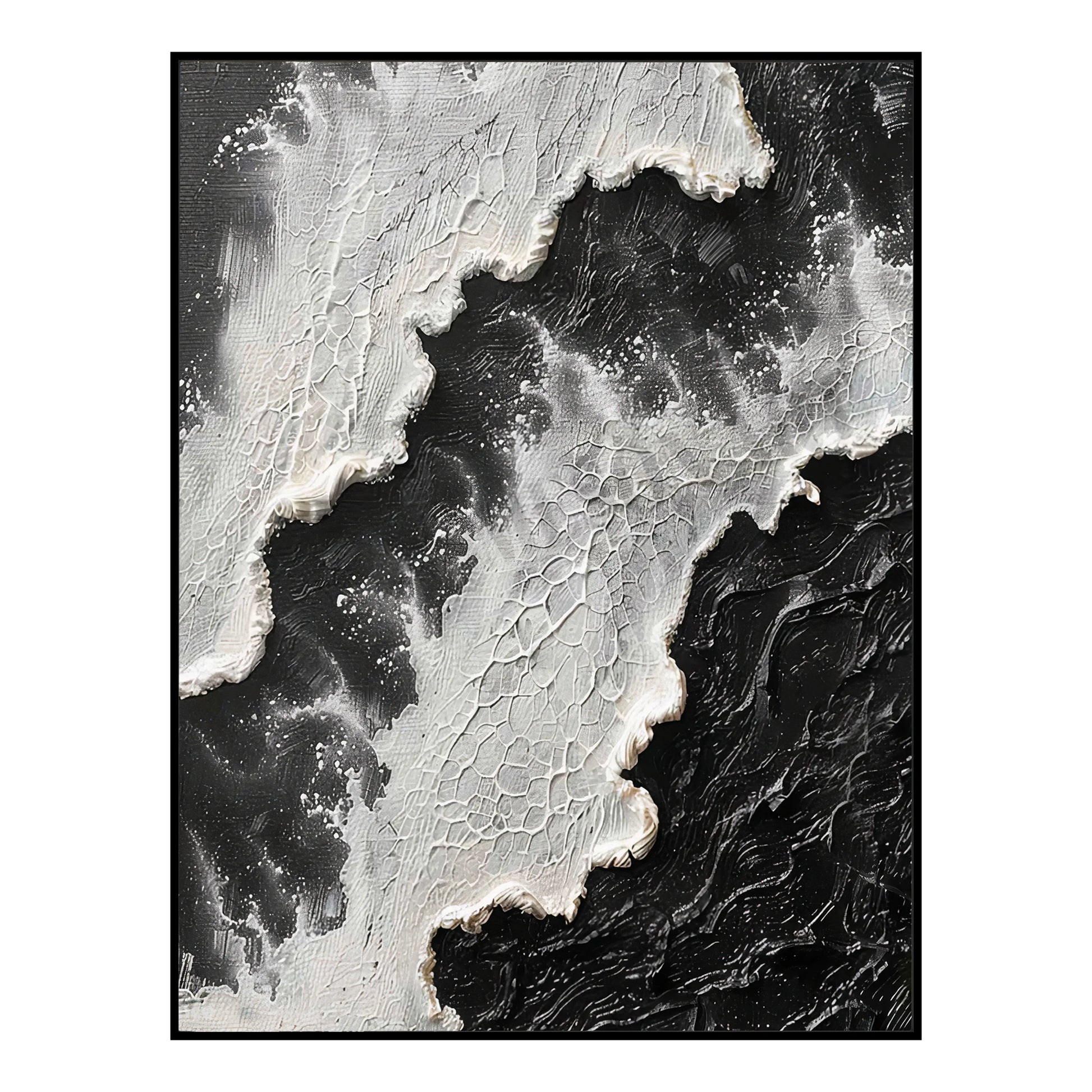 A surge of contrast unfolds in Onyx Storm, where textured waves of white break across deep black, creating the impression of storm-churned waters or fractured stone. The surface crackles with raw energy, a reminder of nature’s untamed forces captured in motion. Both fierce and elegant, the work speaks to resilience, the beauty that emerges in the clash between chaos and order.