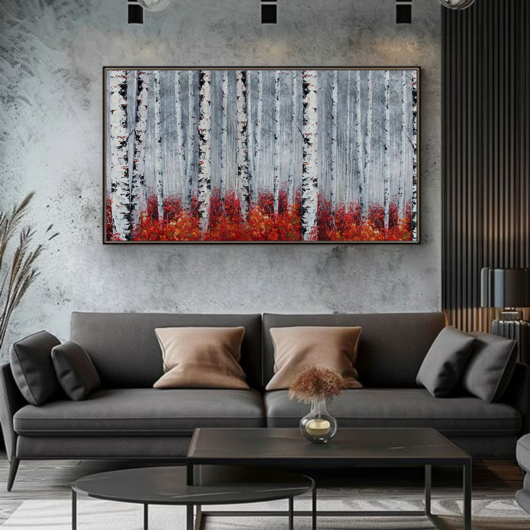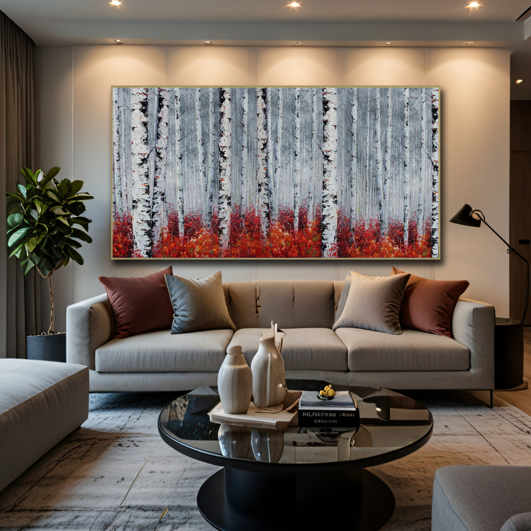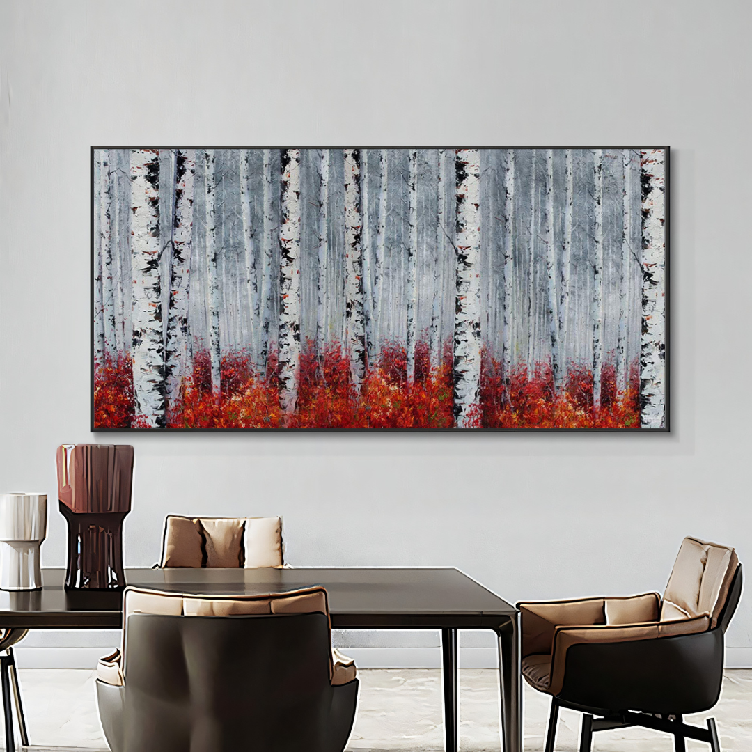 In a forest veiled by winter’s muted grace, a vibrant undercurrent rises—a sea of scarlet flames against a backdrop of stoic birch trunks. The contrast between the fiery undergrowth and the monochrome trees speaks to the resilience of life in even the most desolate landscapes. It is a silent symphony of survival and beauty, where nature reminds us of its eternal cycles, its quiet power, and the bursts of warmth hidden beneath the cold.