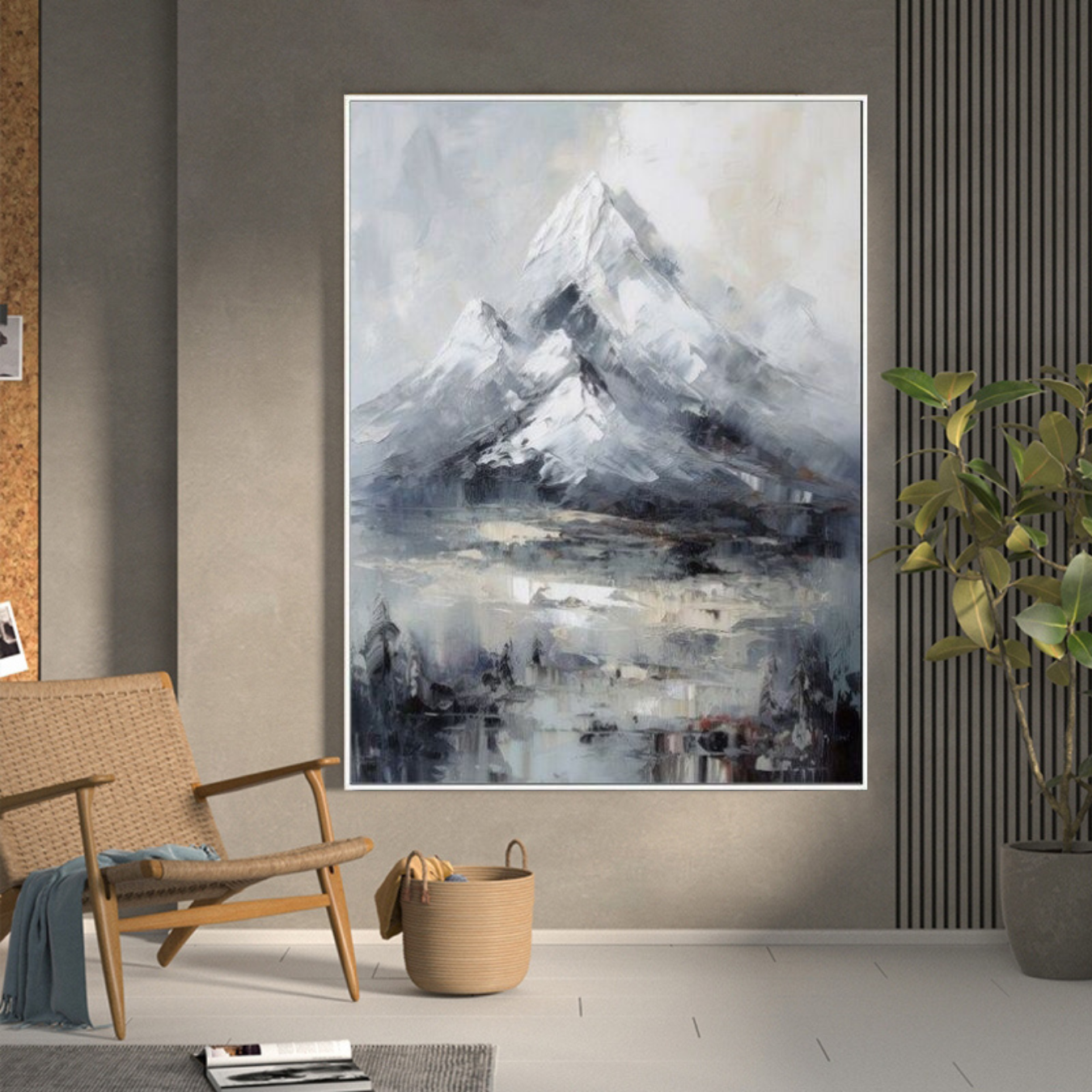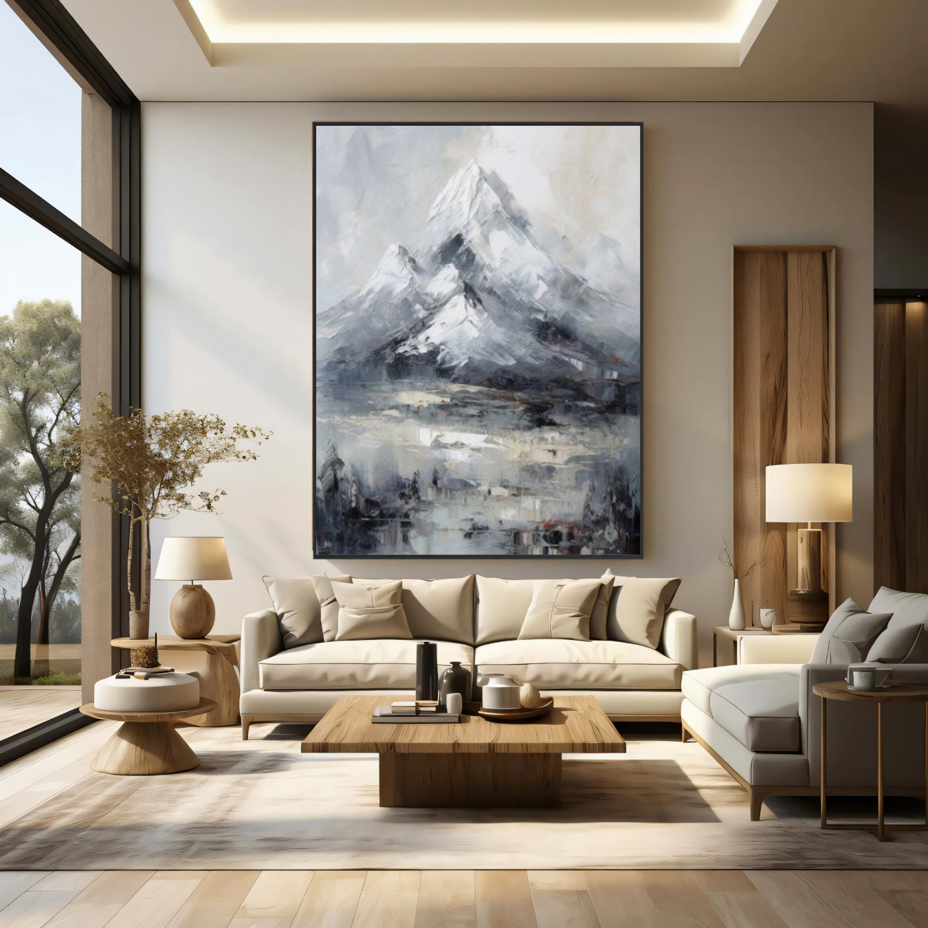 "Shrouded Ascent" evokes the quiet majesty of a snow-covered peak enveloped in mist. Layers of soft, neutral tones create an ethereal atmosphere, where the mountain rises like a serene monument to solitude and introspection. This work invites the viewer to journey inward, discovering tranquility within nature’s veiled wonders.