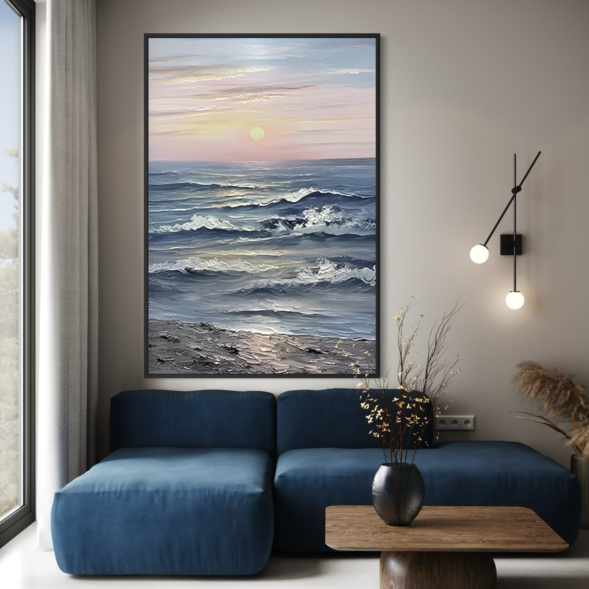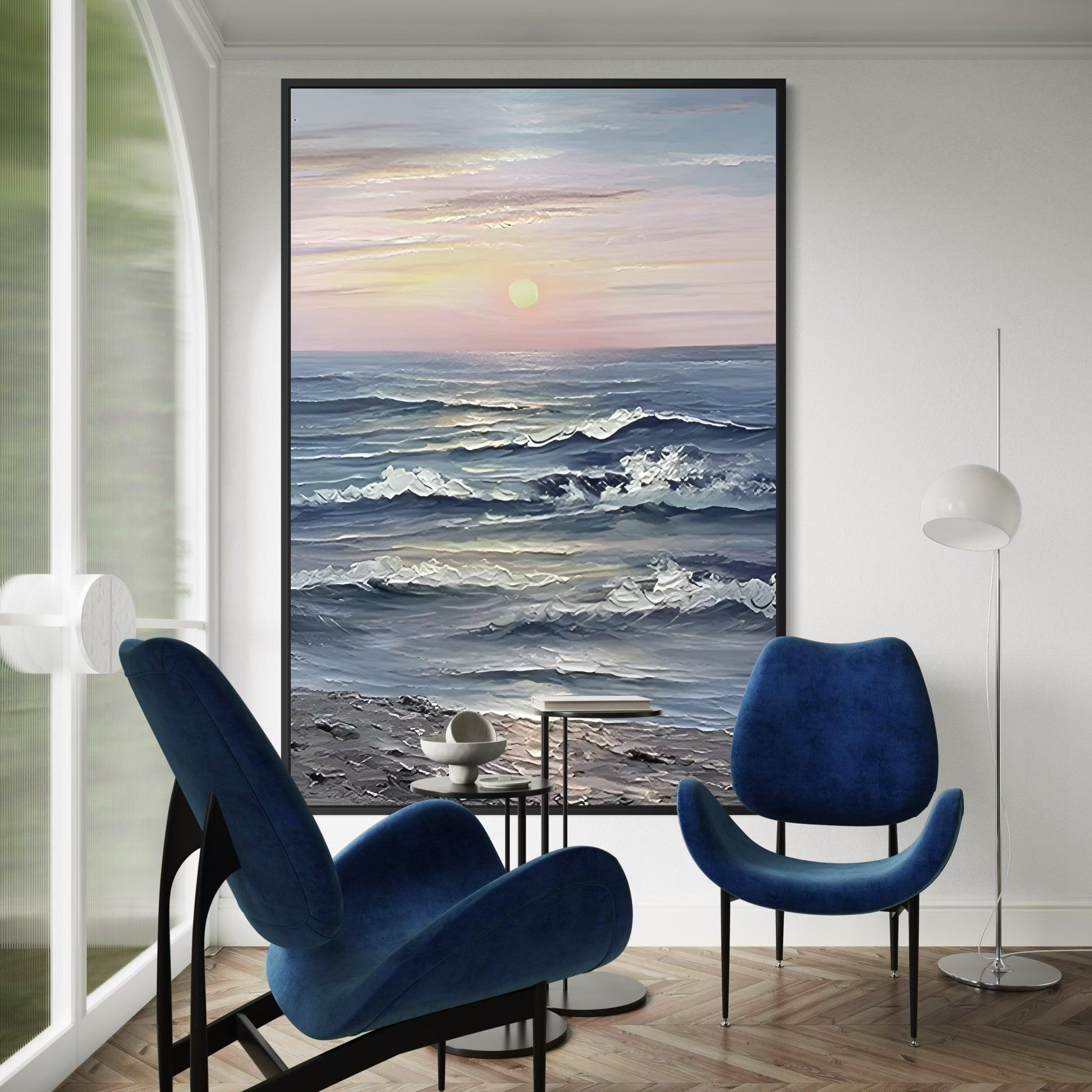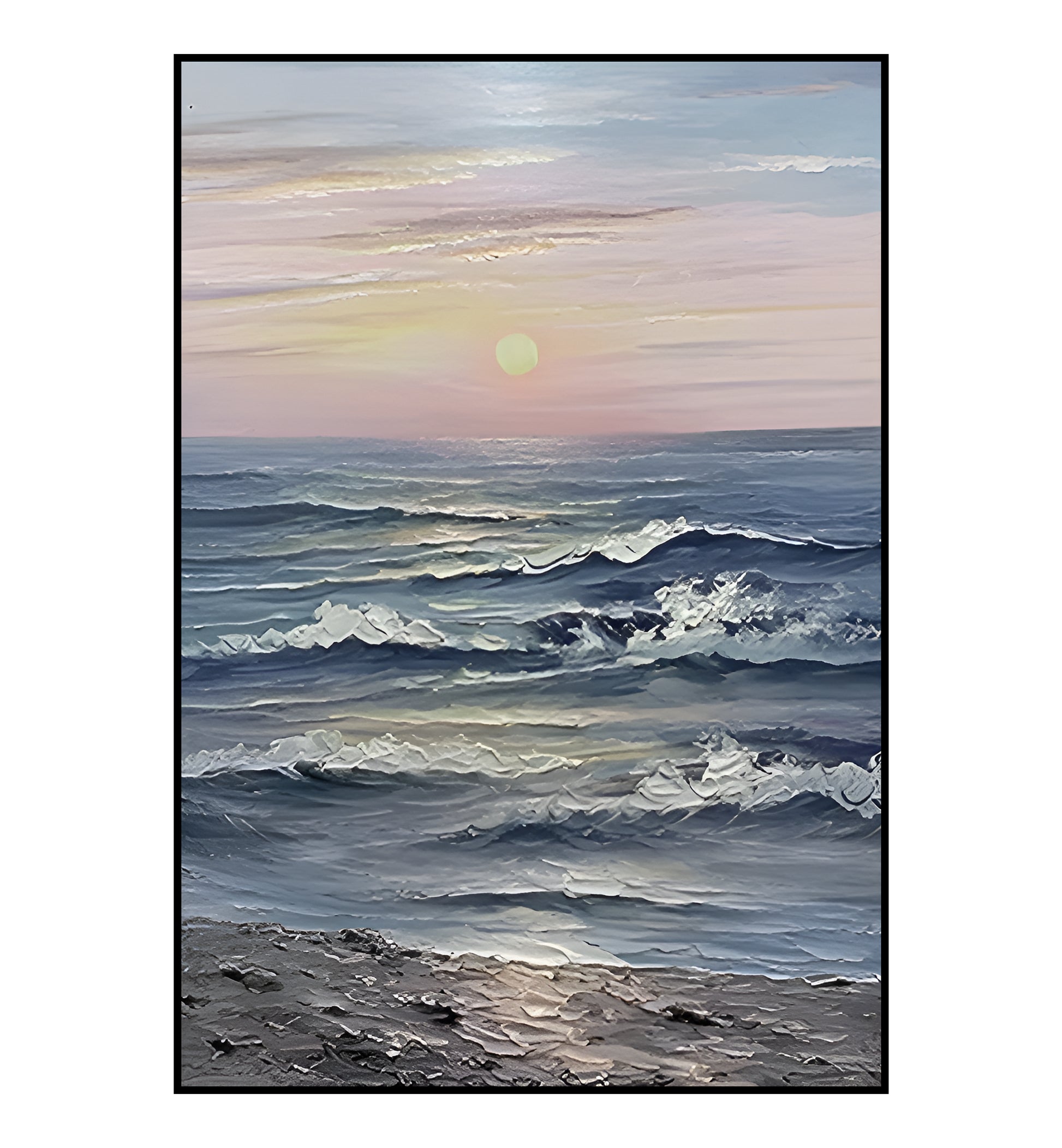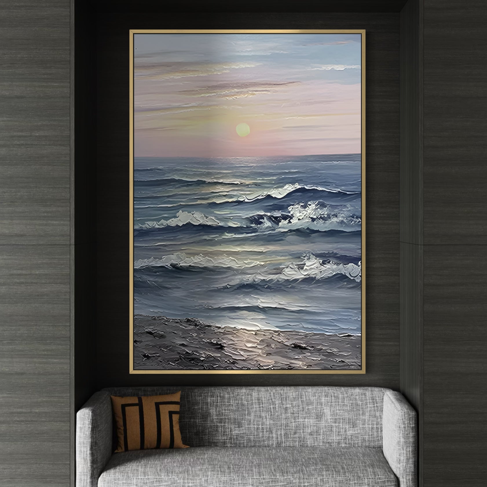 The first piece captures the sun’s low glow over a restless sea, with lavender skies and golden light playing across textured waves. The brushwork balances serenity and power, suggesting both the passage of time and the permanence of the ocean’s rhythm.