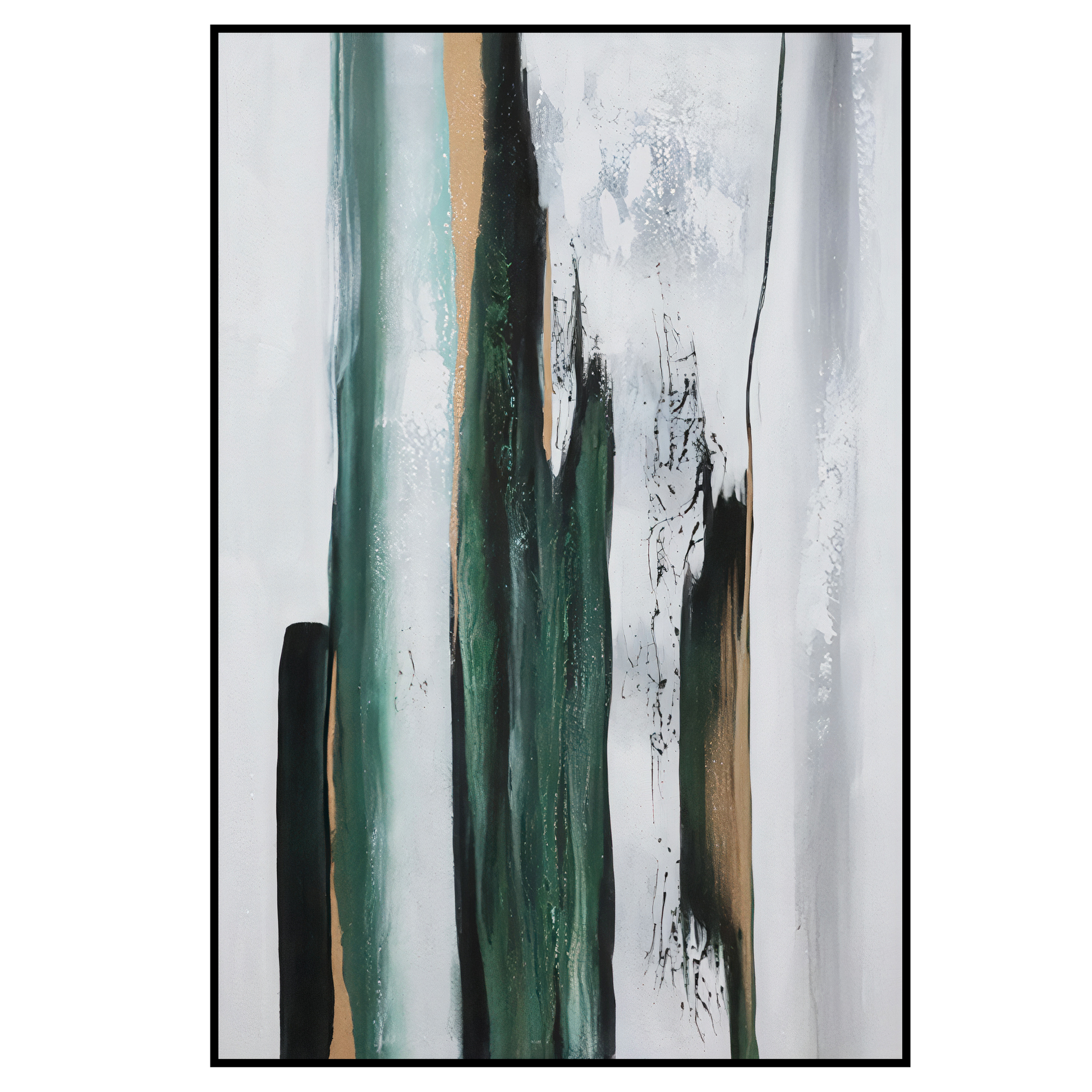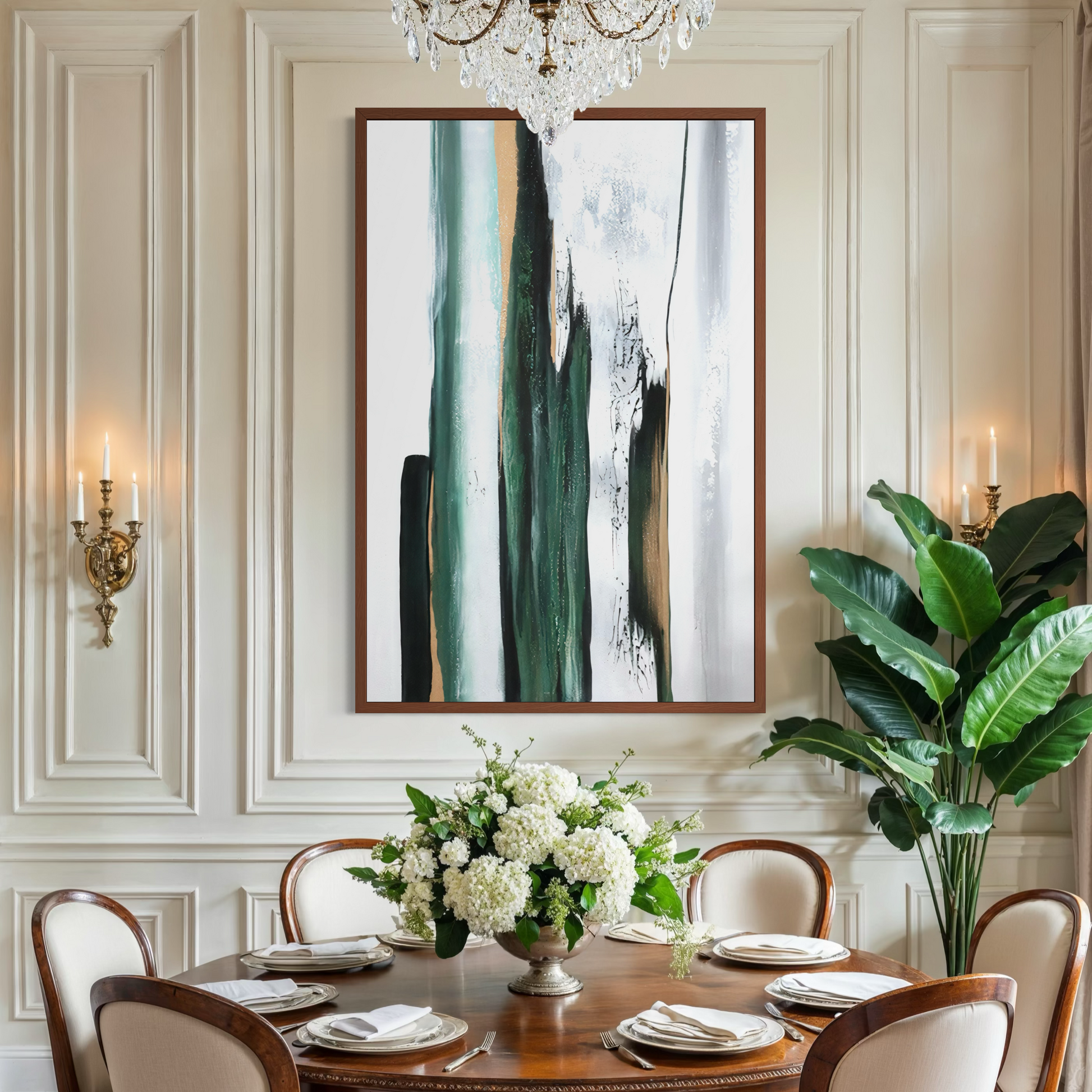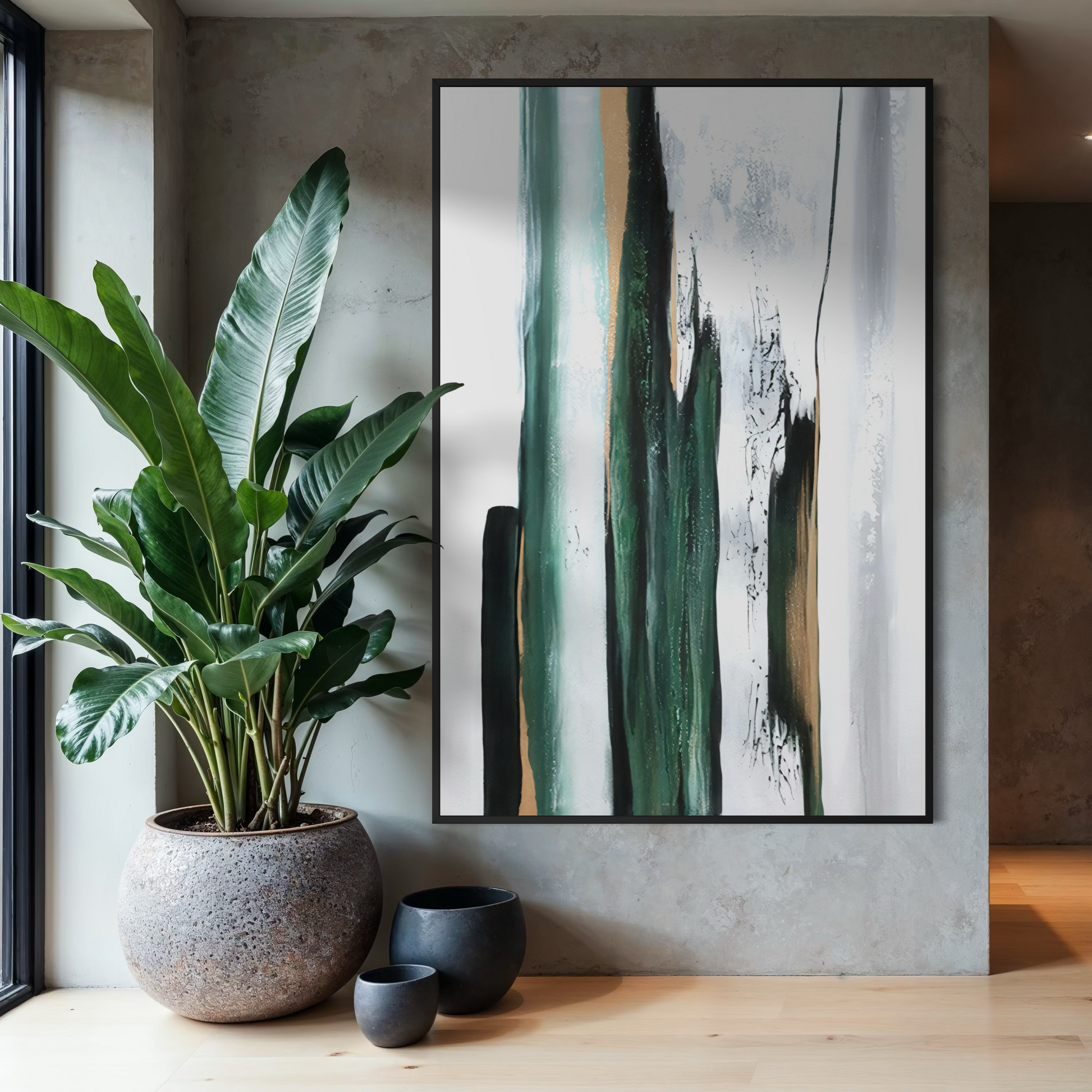 Completing a visual arc, the final moment in a journey threaded with emerald, gold, and restraint. Where earlier pieces in the sequence hum with momentum, The Envoy’s Return arrives with poise. Its vertical textures are deliberate, softened by tonal transitions, but held firm by structure and contrast.