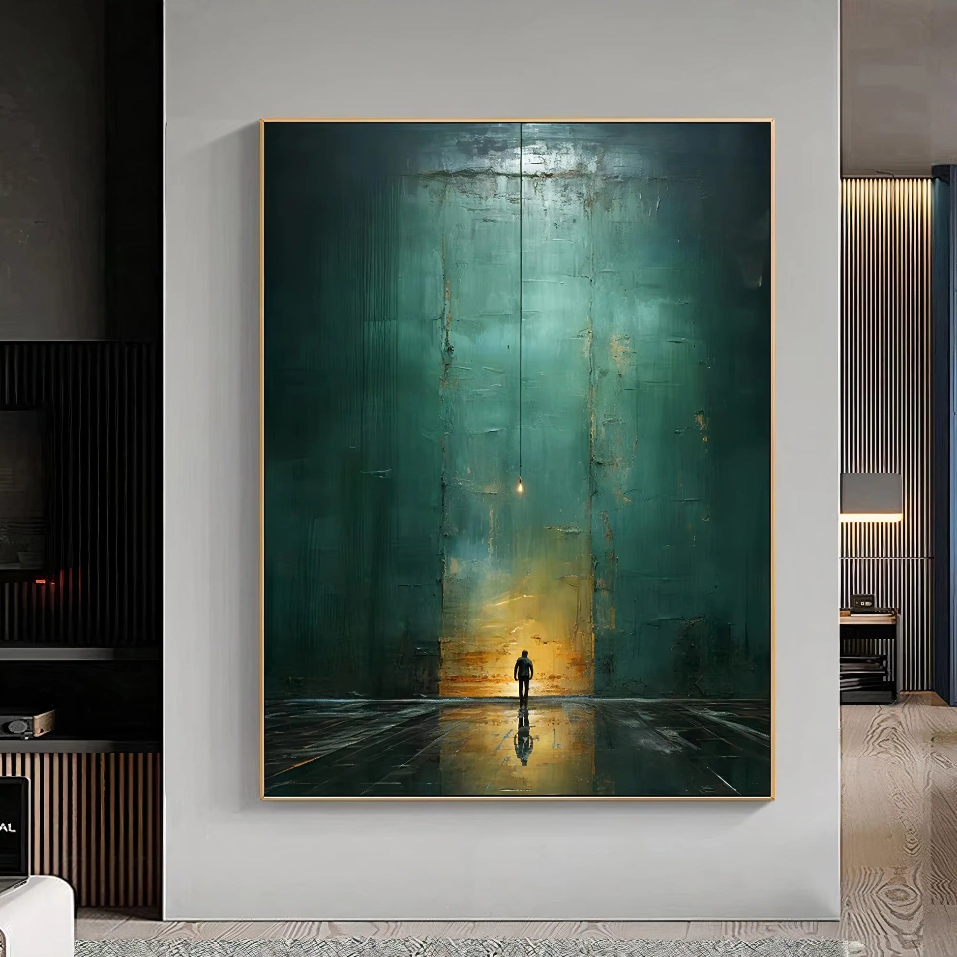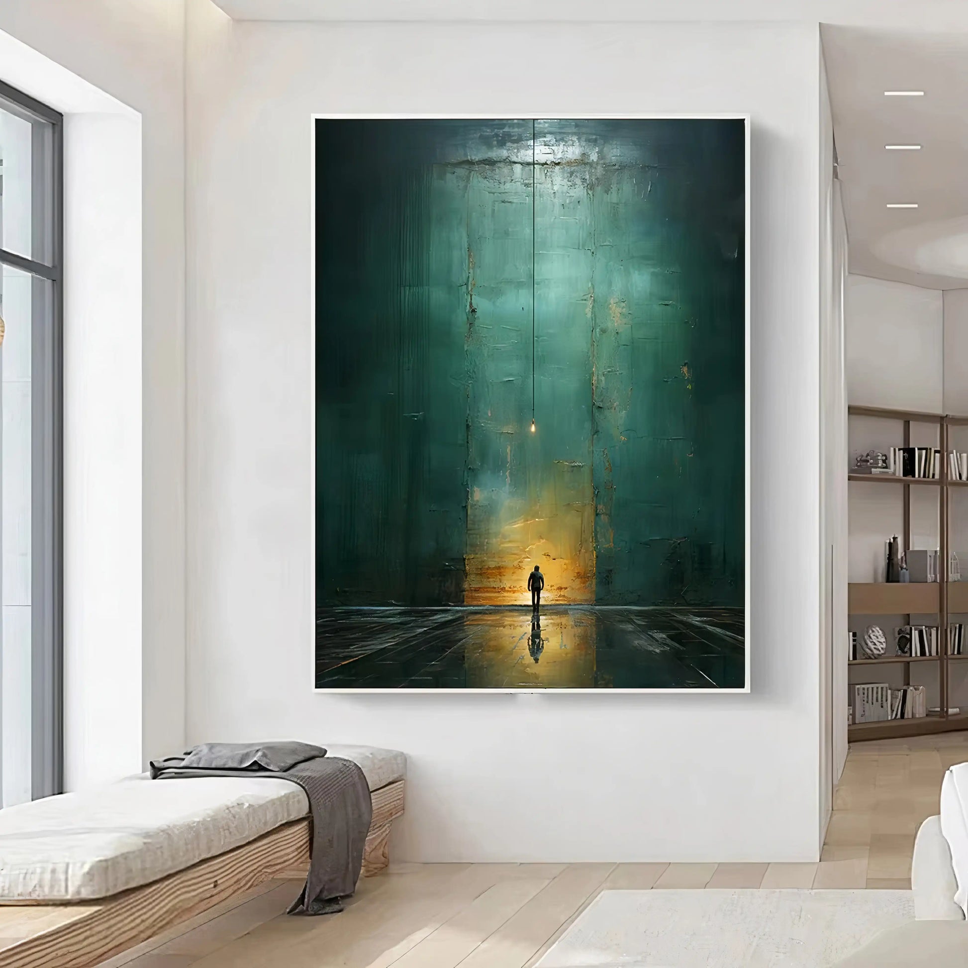 Set against a towering expanse of deep teal and distressed gold, the figure is dwarfed by the unknown, yet illuminated by a subtle golden glow, a visual metaphor for courage, surrender, and the sacred pause before change.