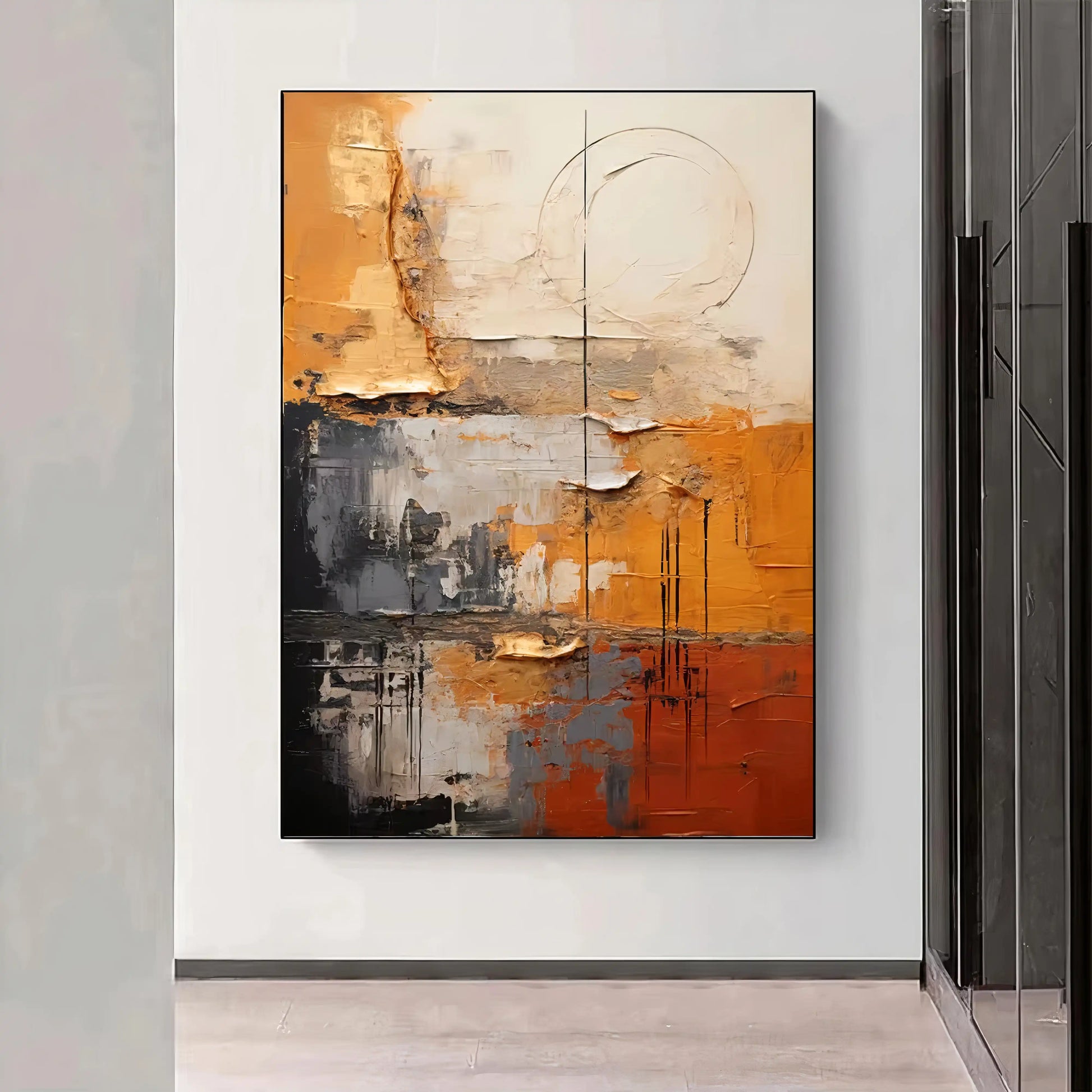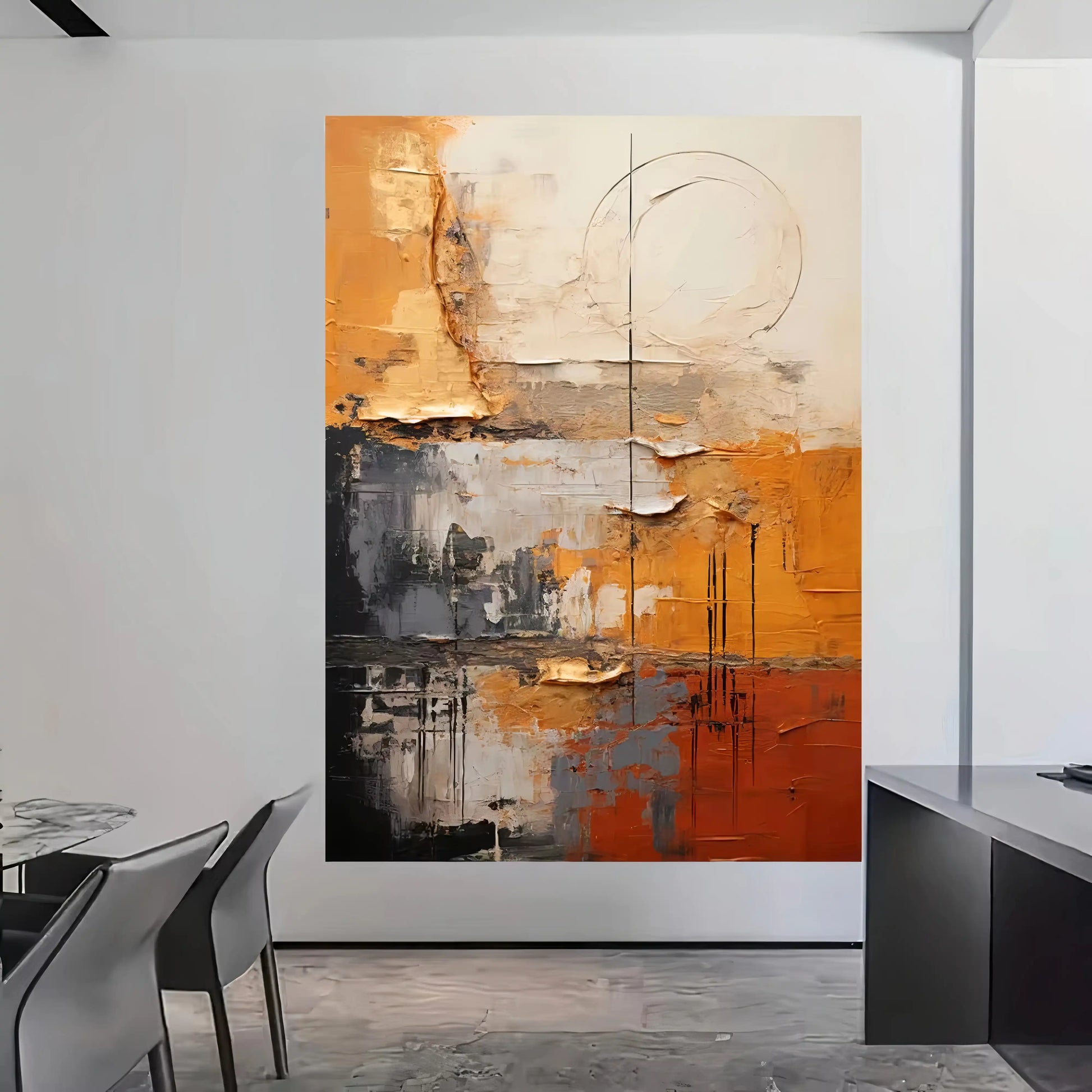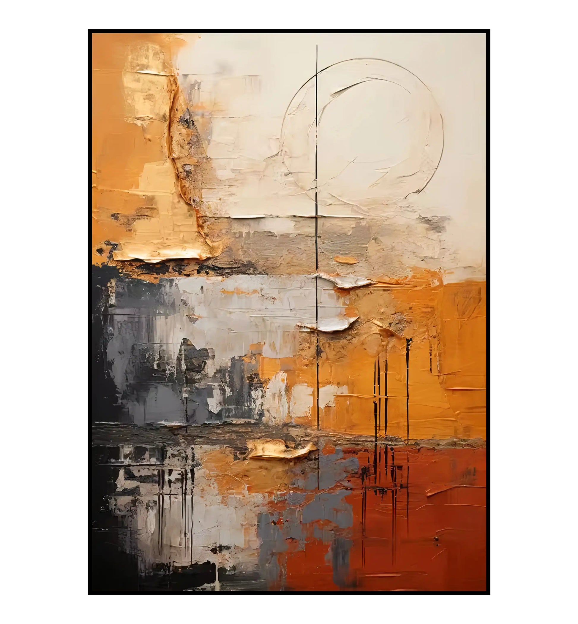 Where the Horizon Burns holds the moment when light transforms the sky into something almost tangible. Rich ochre and rust tones rise from the base, layered with deep charcoal and soft grey, their textures fractured like shifting ground. Above, a pale circular form suggests the sun through haze, its glow diffused yet insistent. Painted in acrylic with bold impasto, every ridge and scrape carries movement, as though the air itself is in flux. This is a work that invites the collector to linger at the edge of day, where the horizon blurs between earth, sky, and memory.