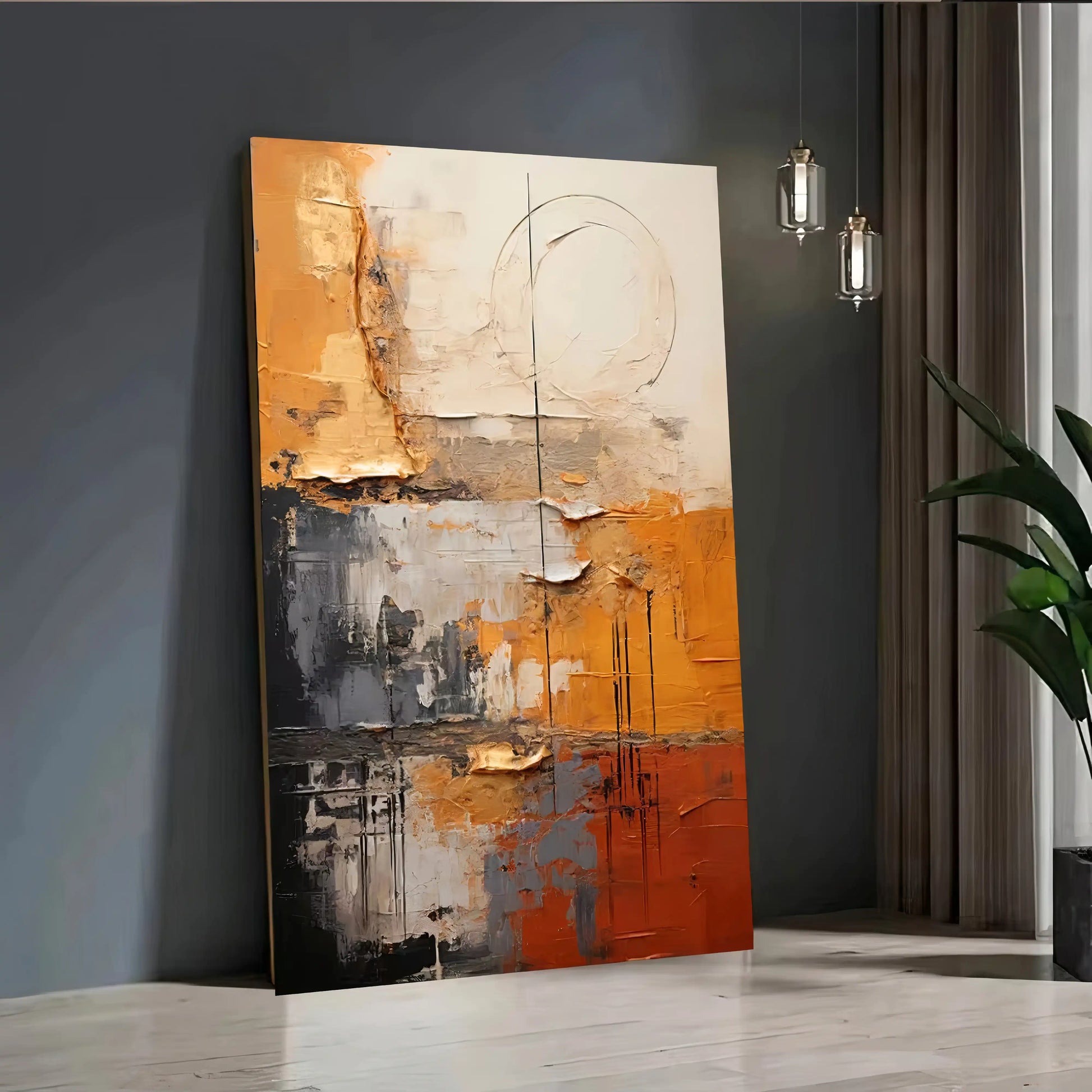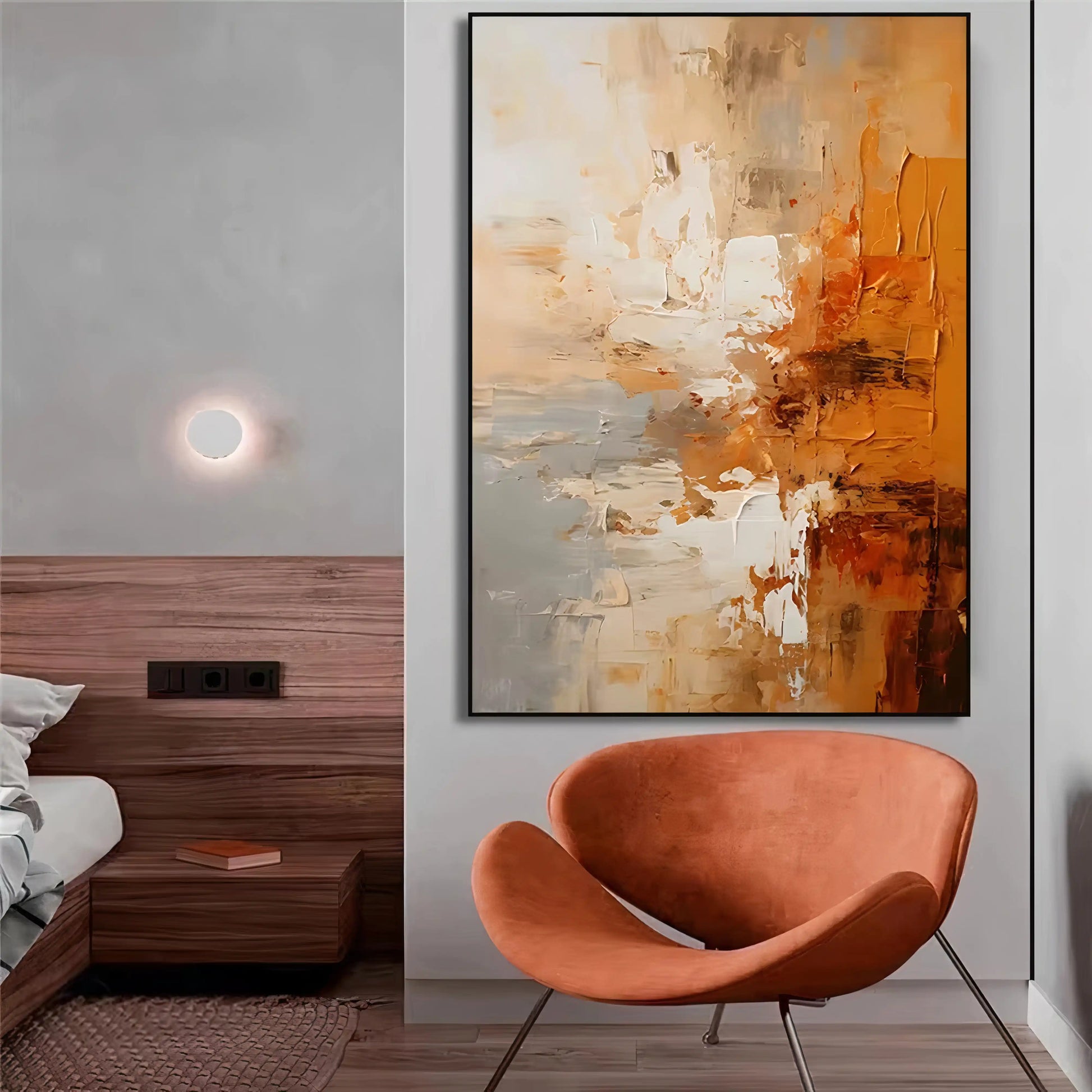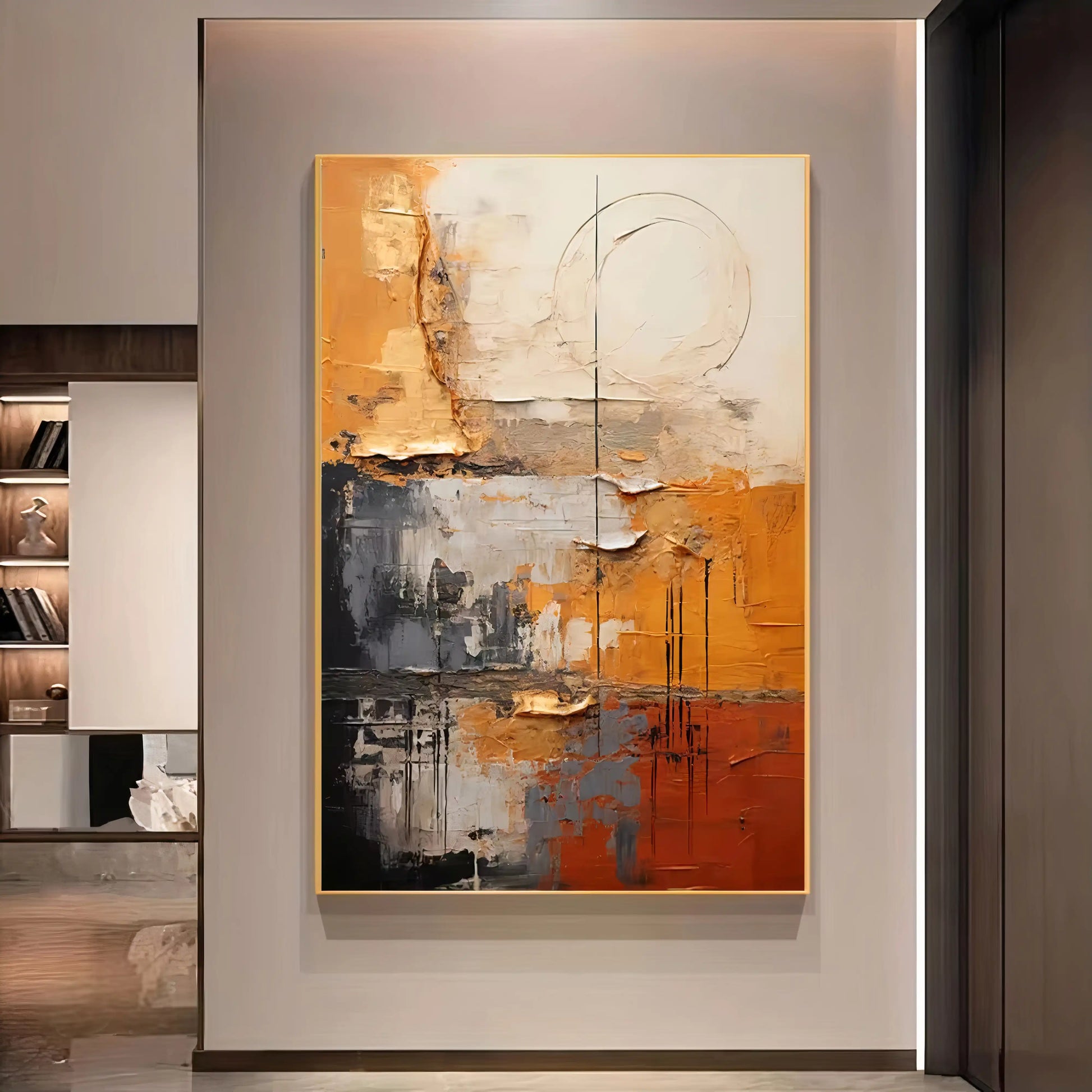 Where the Horizon Burns holds the moment when light transforms the sky into something almost tangible. Rich ochre and rust tones rise from the base, layered with deep charcoal and soft grey, their textures fractured like shifting ground. Above, a pale circular form suggests the sun through haze, its glow diffused yet insistent. Painted in acrylic with bold impasto, every ridge and scrape carries movement, as though the air itself is in flux. This is a work that invites the collector to linger at the edge of day, where the horizon blurs between earth, sky, and memory.