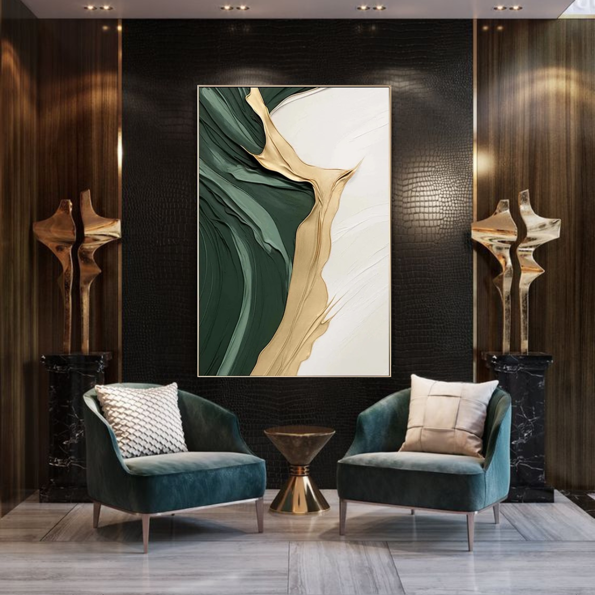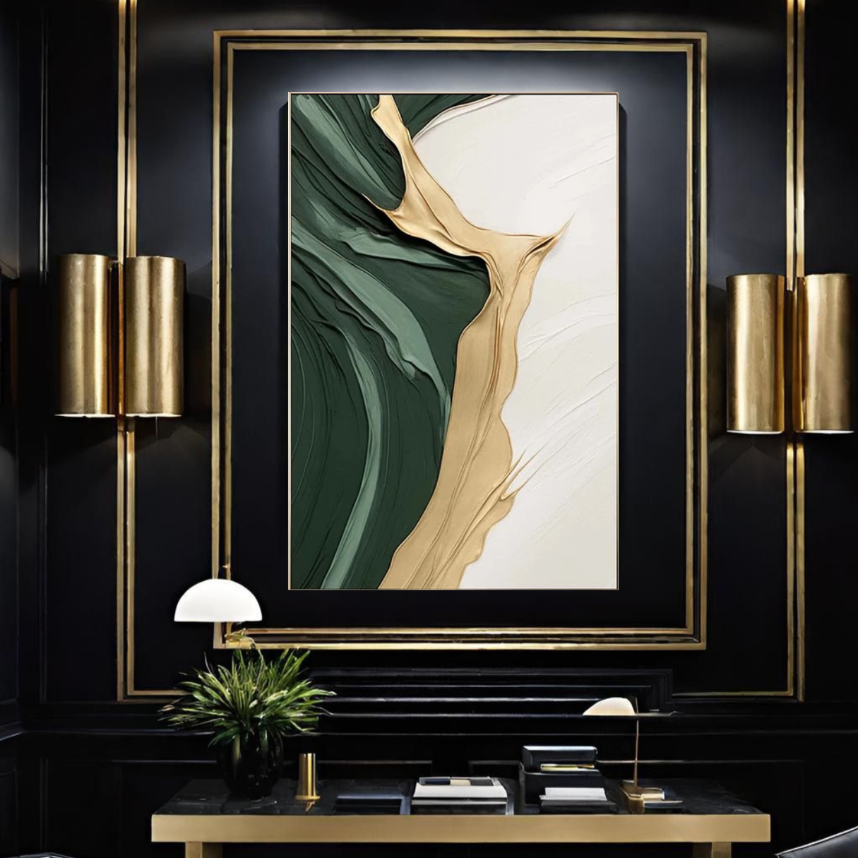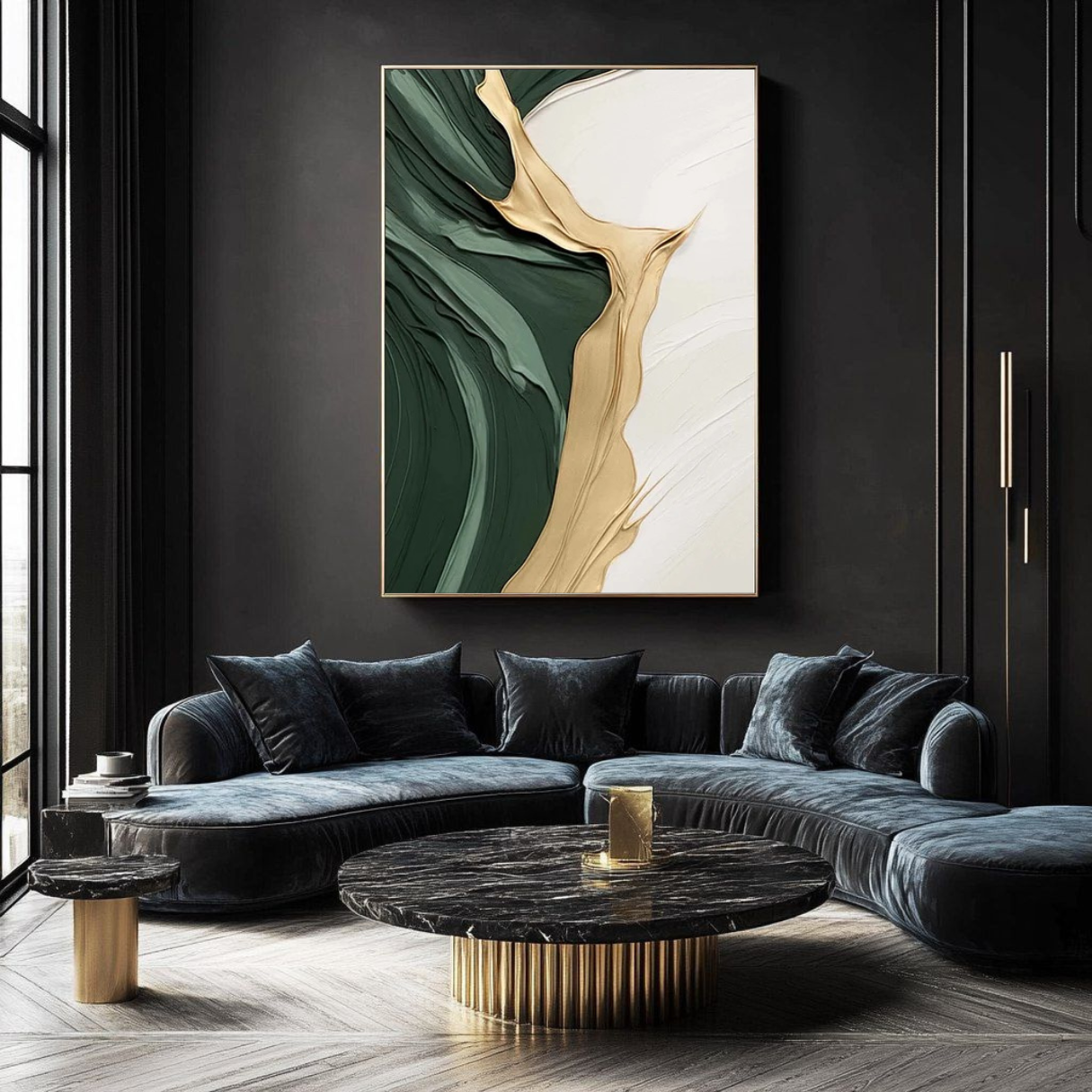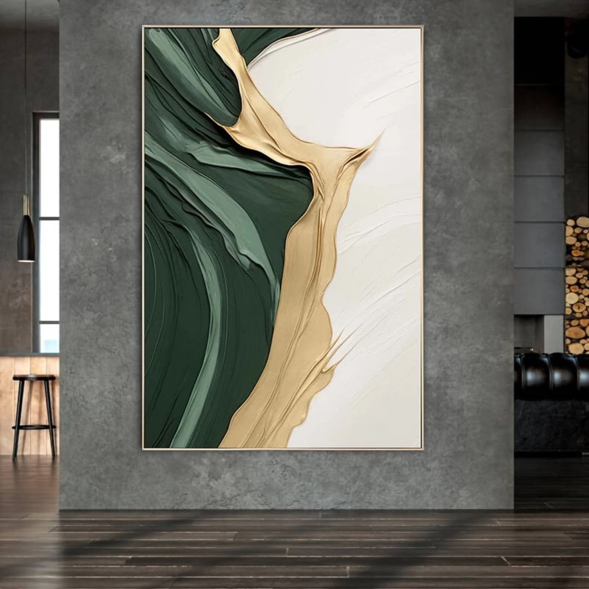 A deep, textured green anchors one side of the canvas, contrasted by a luminous river of gold cutting through, its fluid motion both bold and effortless. The ivory expanse beyond offers space—like a breath between intensity and stillness. A balance of richness and restraint, this piece speaks to the beauty of contrast: movement and stillness, depth and light, presence and possibility.